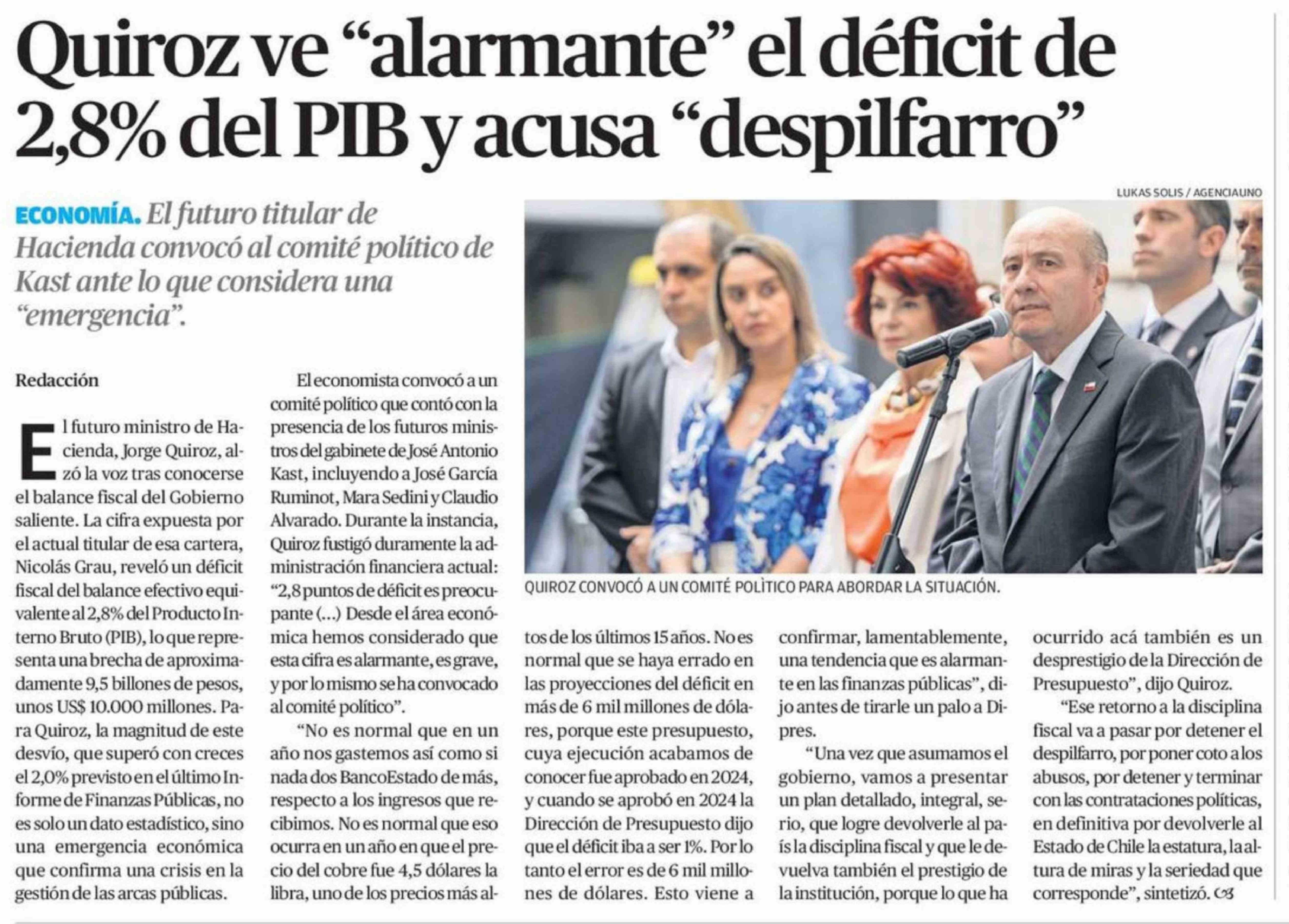 Título: Quiroz ve "alarmante" el déficit de 2,8% del PIB y acusa "despilfarro"