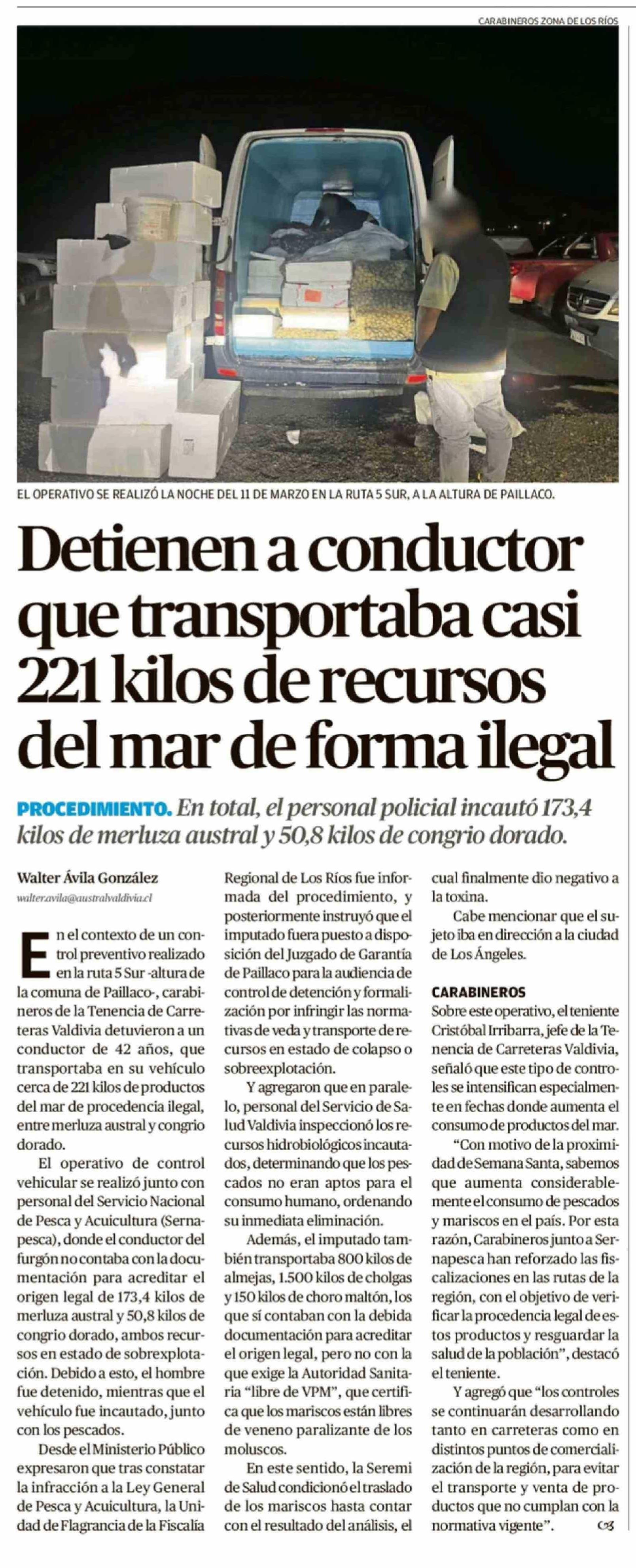 Detienen a conductor que transportaba casi 221 kilos de recursos del mar de forma ilegal 13-03-2026 Diario Austral Región de Los Ríos |