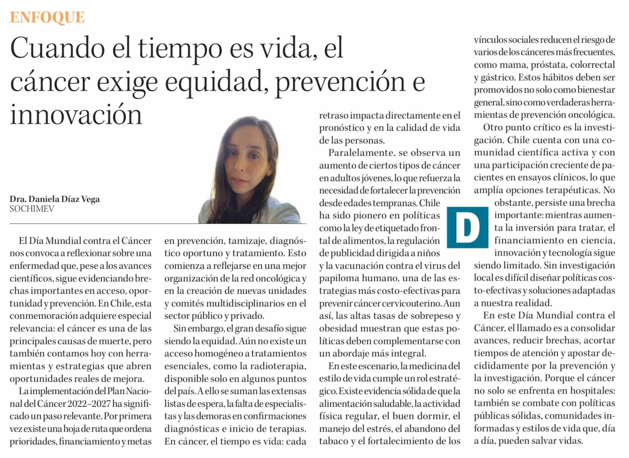 Columnas de Opinión: Cuando el tiempo es vida, el cáncer exige equidad, prevención e innovación 05-02-2026 Diario Concepción |