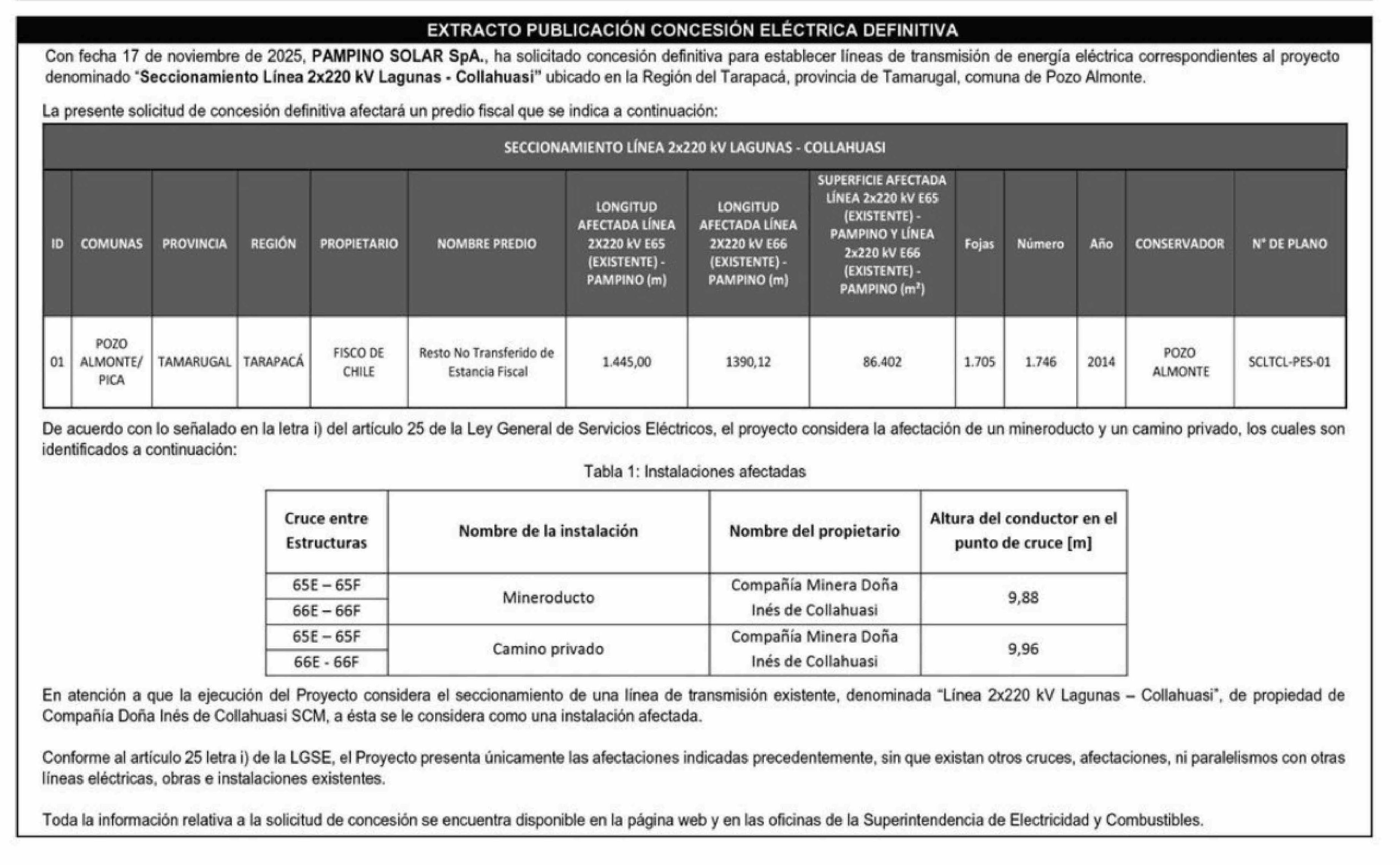 Título: Extractos: EXTRACTO PUBLICACIÓN CONCESIÓN ELÉCTRICA DEFINITIVA Con fecha 17 de noviembre de 2025, PAMPINO SOLAR SpA., ha solicitado concesión definitiva para establecer líneas de transmisión de energía eléctrica correspondientes al proyecto denominado "Seccionamiento Linea 2x220 kV Lagunas - Collahu