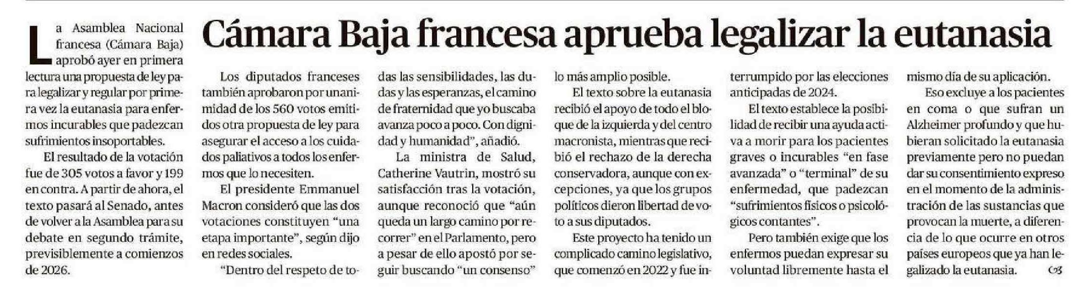 Título: Cámara Baja francesa aprueba legalizar la eutanasia