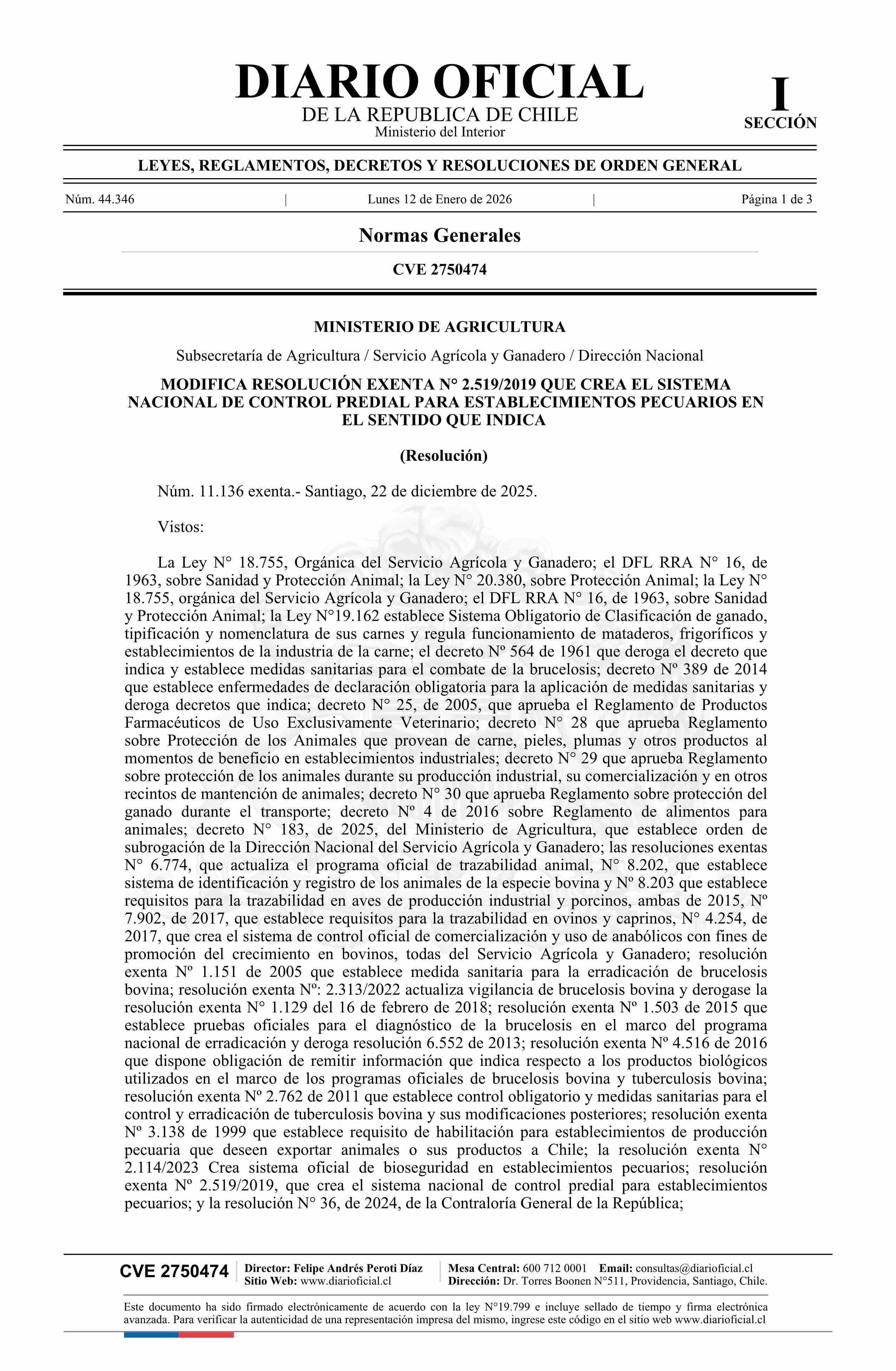 Título: Resolución exenta número 11.136, de 2025.- Modifica resolución exenta N° 2.519/2019 que crea el Sistema Nacional de Control Predial para Establecimientos Pecuarios