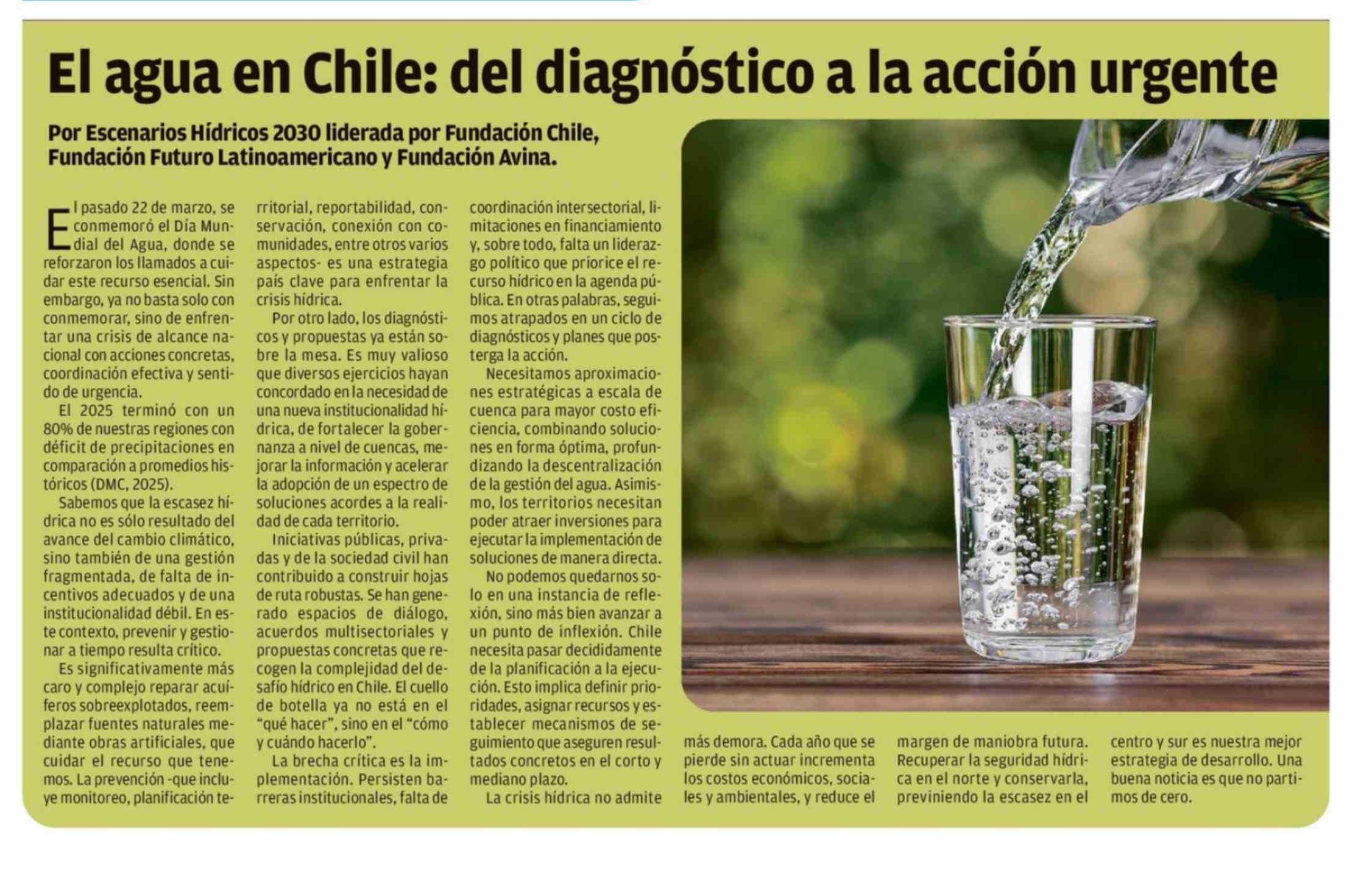 El agua en Chile: del diagnóstico a la acción urgente 31-03-2026 El Mercurio de Antofagasta |