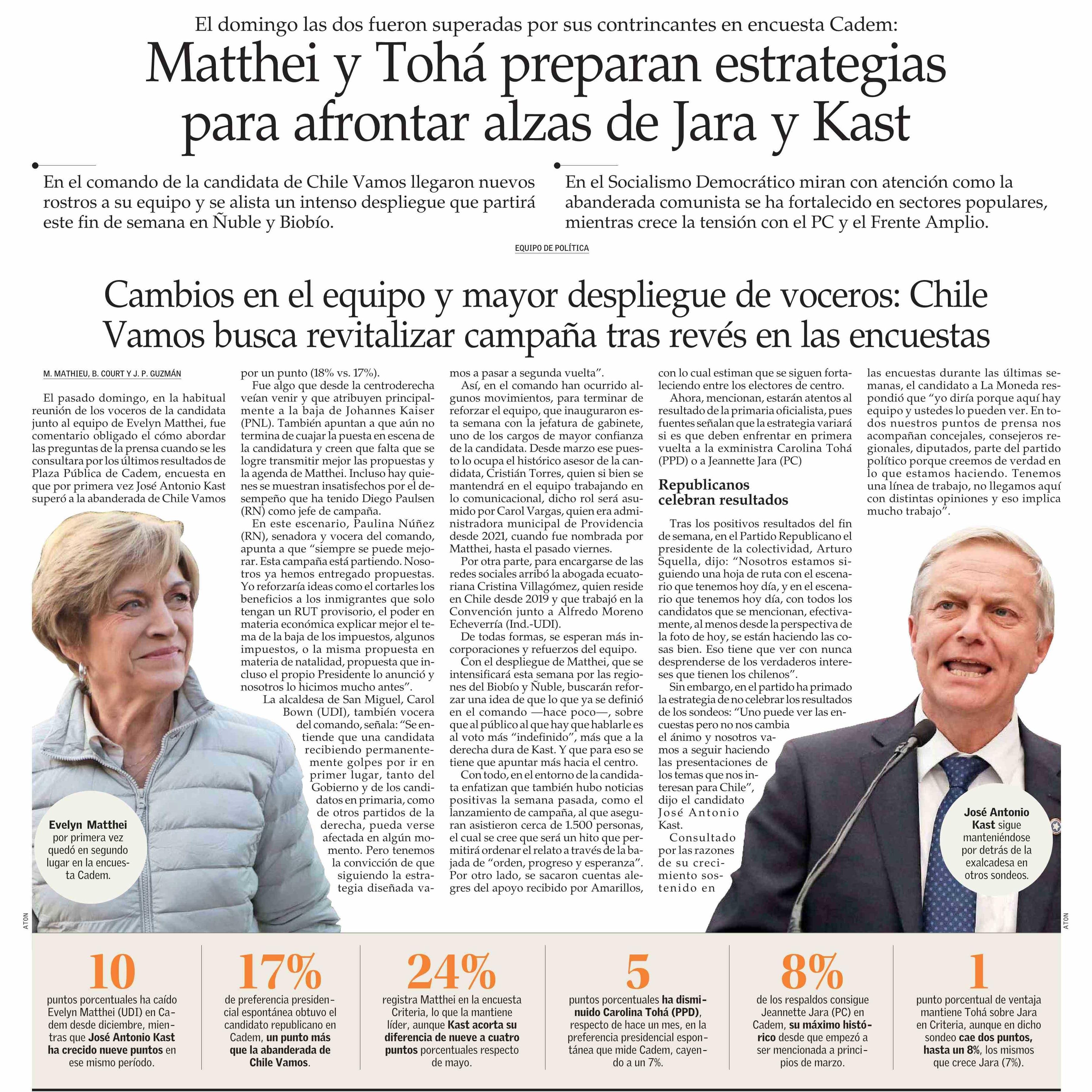 Matthei y Tohá preparan estrategias para afrontar alzas de Jara y Kast 10-06-2025 El Mercurio |