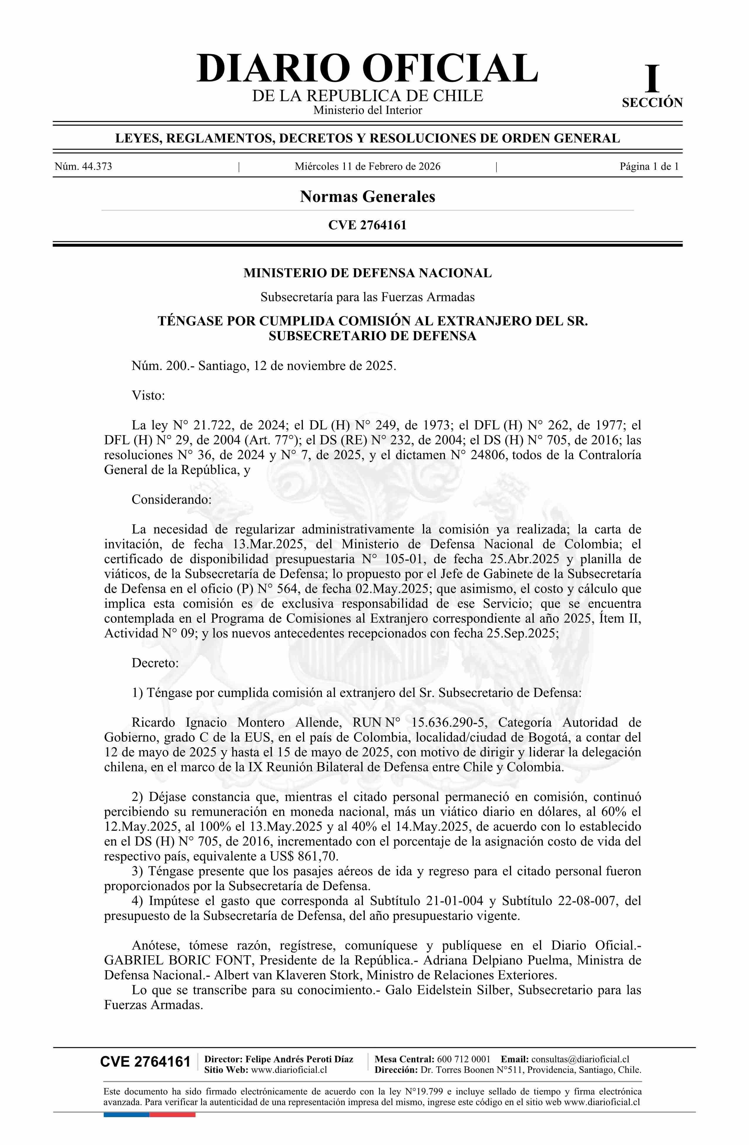 Decreto número 200, de 2025.- Da por cumplida comisión de servicio de don Ricardo Ignacio Montero Allende, Subsecretario de Defensa, a la ciudad de Bogotá, Colombia 11-02-2026 Diario Oficial Edición Electrónica |