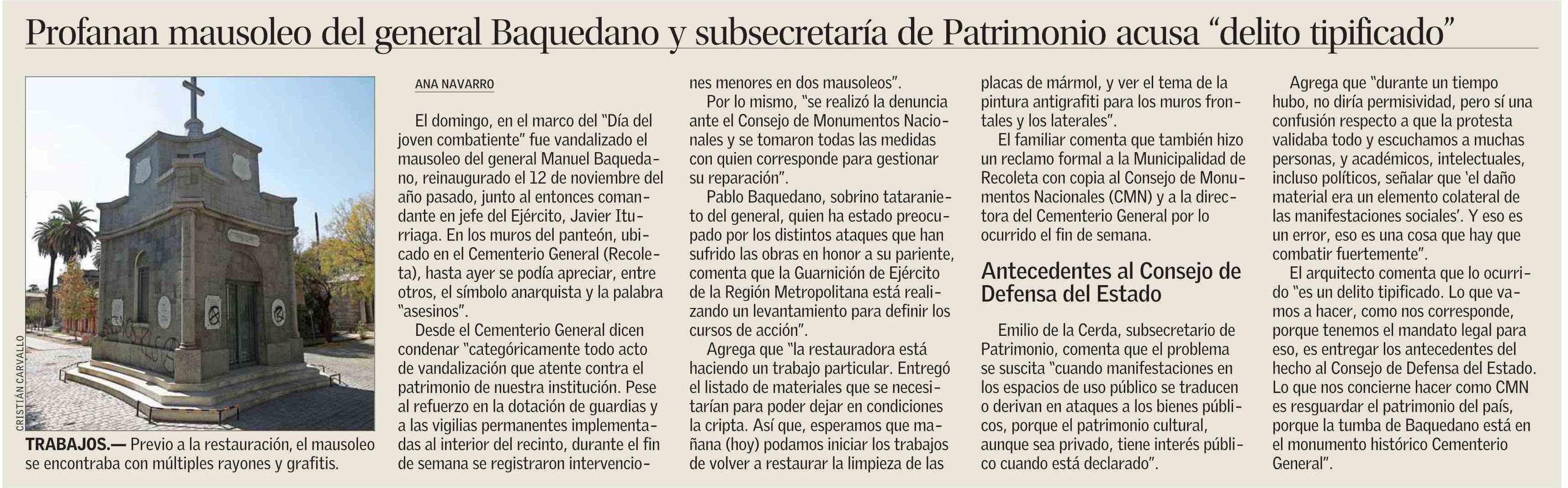 Título: Profanan mausoleo del general Baquedano y subsecretaría de Patrimonio acusa “delito tipificado”