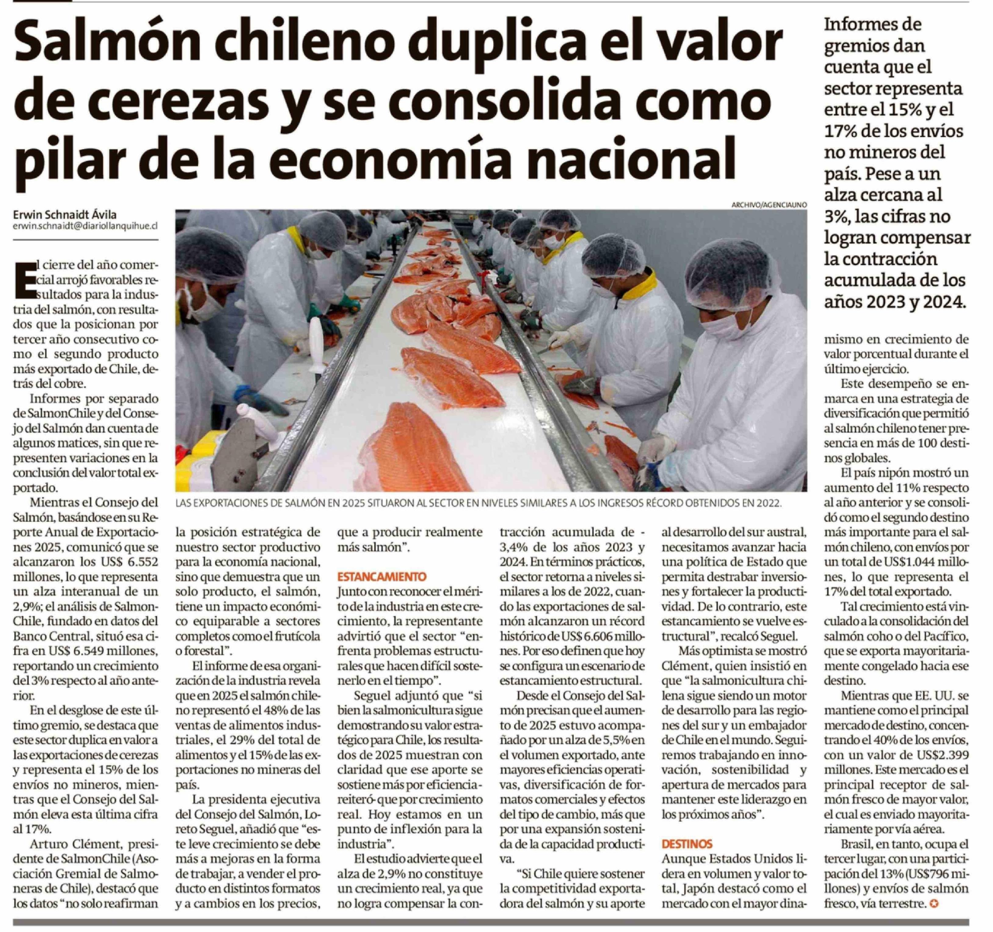 | Título: | Salmón chileno duplica el valor de cerezas y se consolida como pilar de la economía nacional |