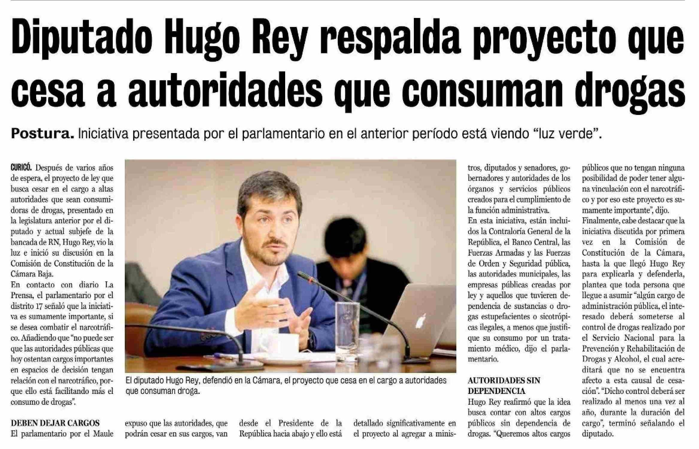 Título: Diputado Hugo Rey respalda proyecto que cesa a autoridades que consuman drogas