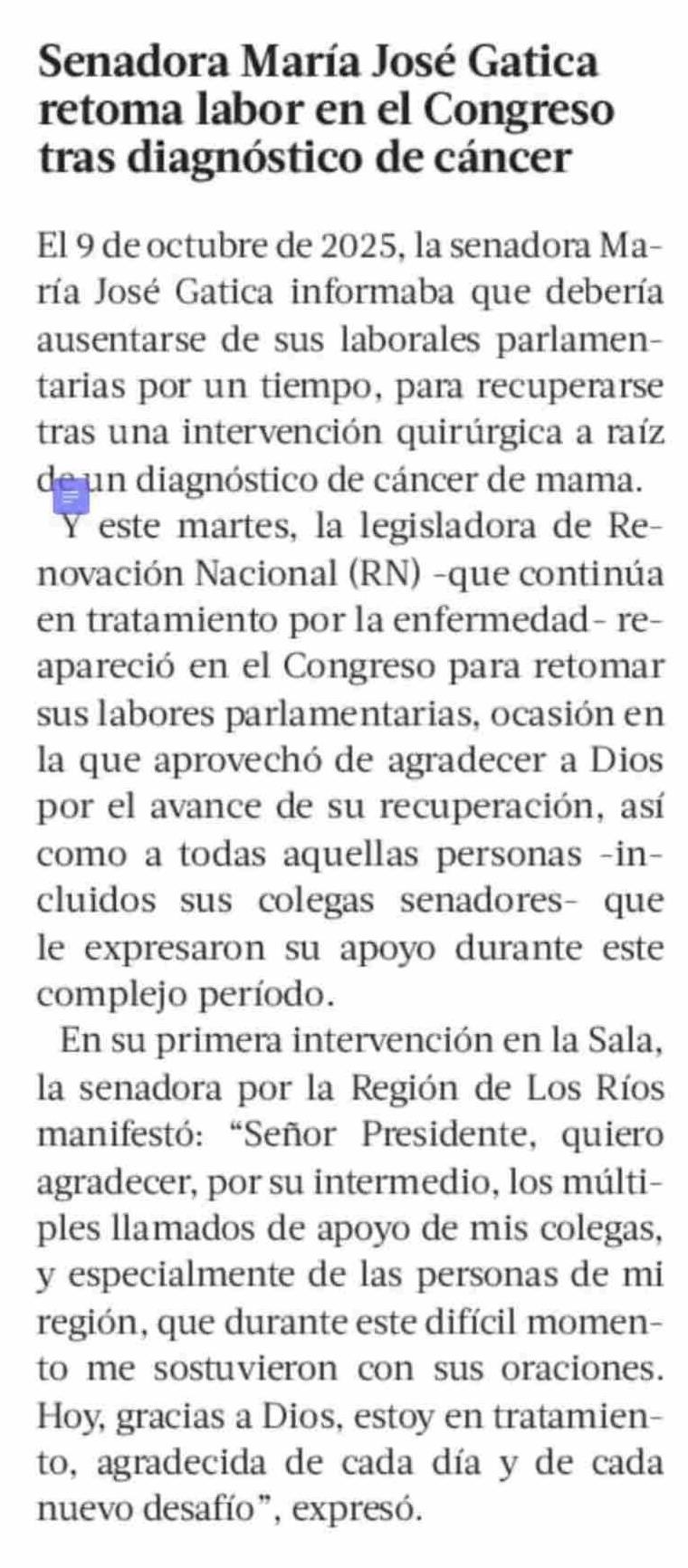 Título: Senadora María José Gatica retoma labor en el Congreso tras diagnóstico de cáncer