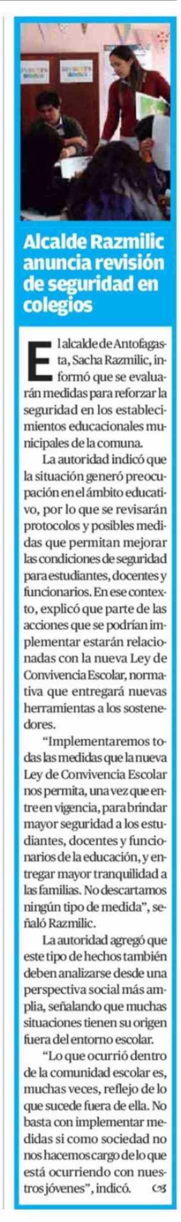 Alcalde Razmilic anuncia revisión de seguridad en colegios 31-03-2026 El Mercurio de Calama |