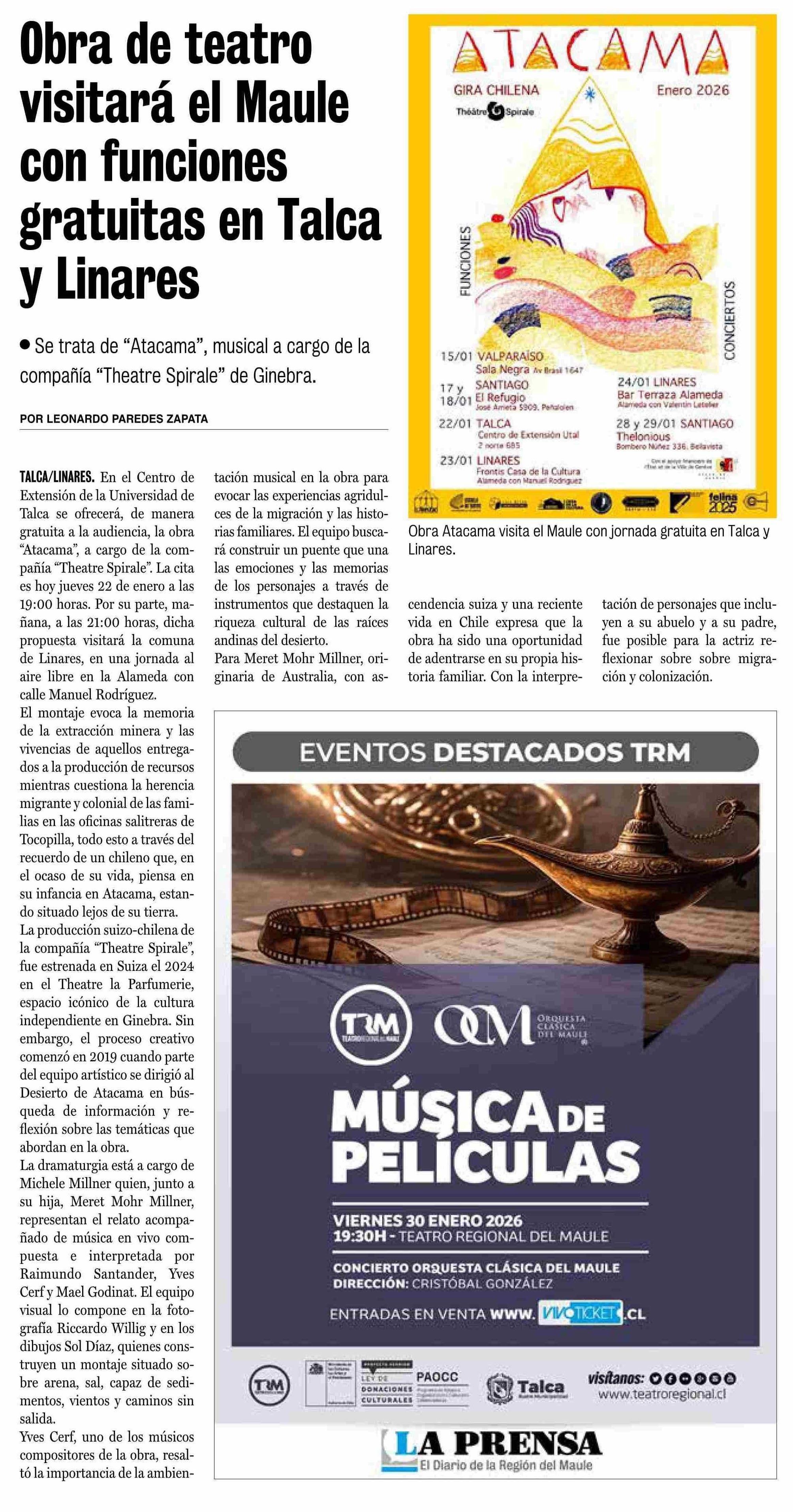 Obra de teatro visitará el Maule con funciones gratuitas en Talca y Linares 22-01-2026 La Prensa de Curicó |