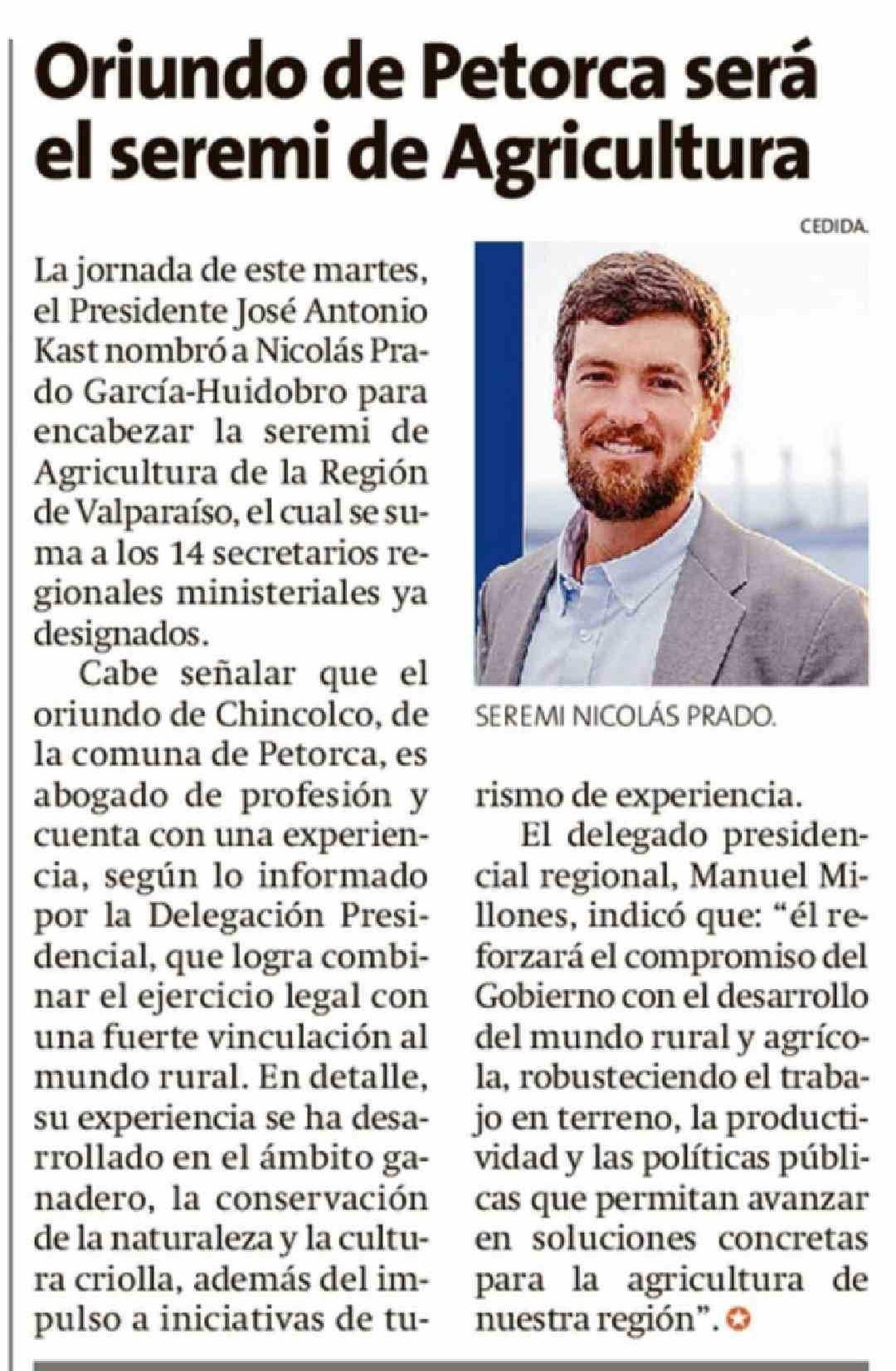 Oriundo de Petorca será el seremi de Agricultura 01-04-2026 La Estrella de Valparaíso |