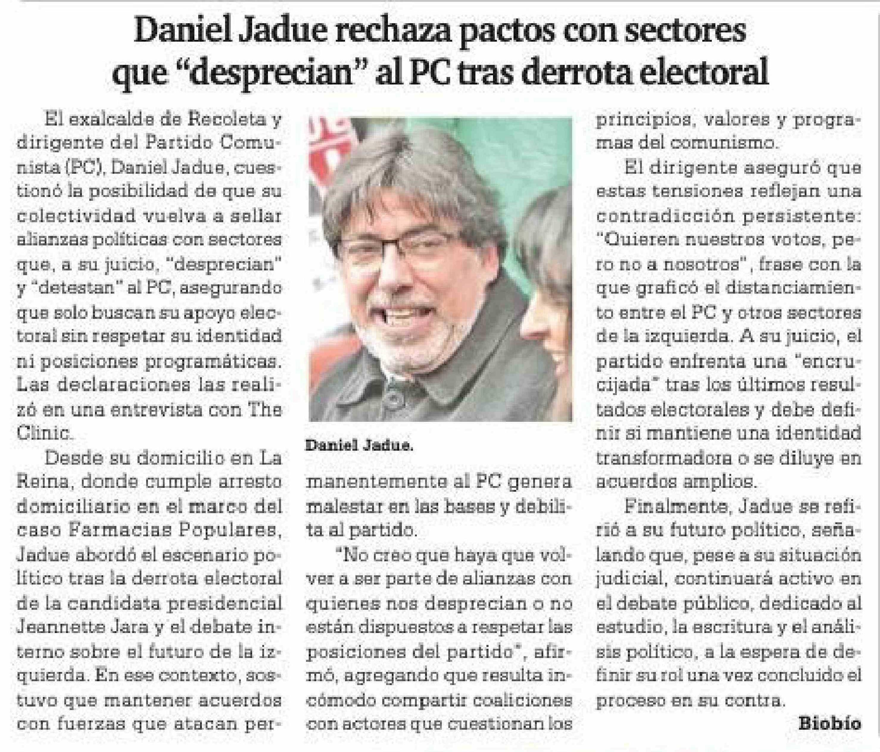 Título: Daniel Jadue rechaza pactos con sectores que "desprecian" al PC tras derrota electoral