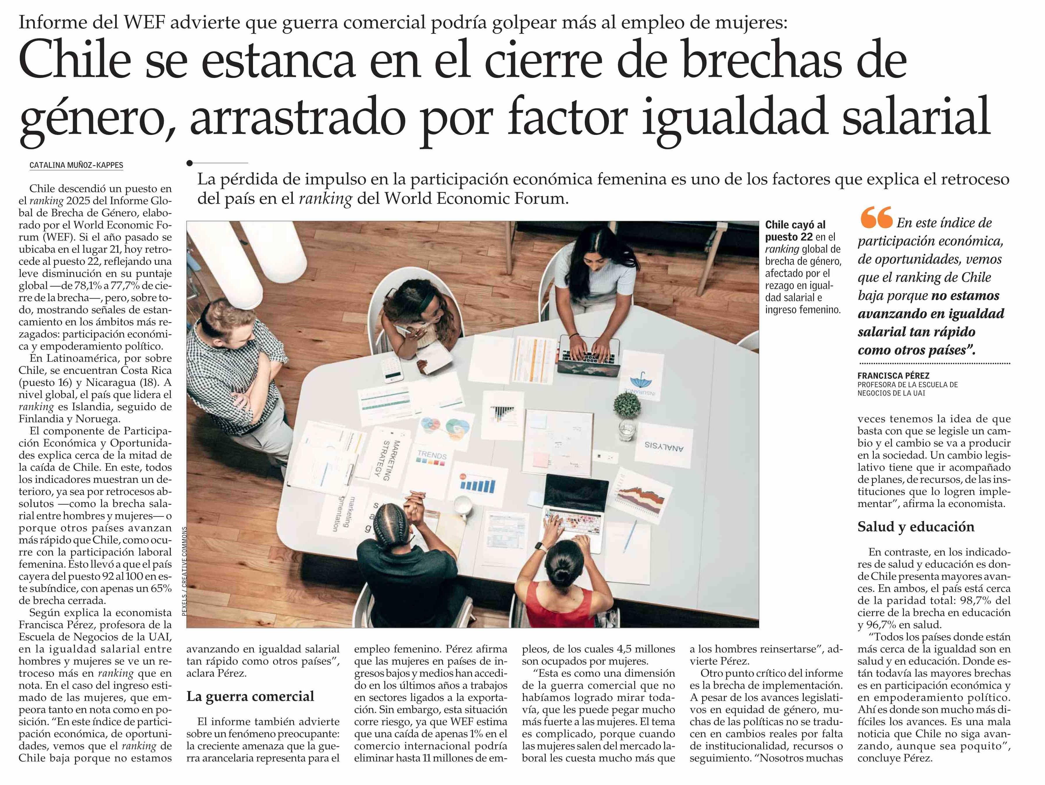 Chile se estanca en el cierre de brechas de género, arrastrado por factor igualdad salarial 23-06-2025 El Mercurio |
