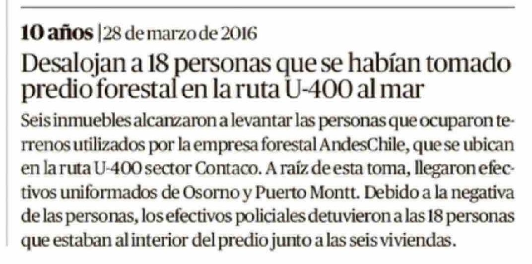 | Título: | Desalojan a 18 personas que se habían tomado predio forestal en la ruta U-400 al mar |