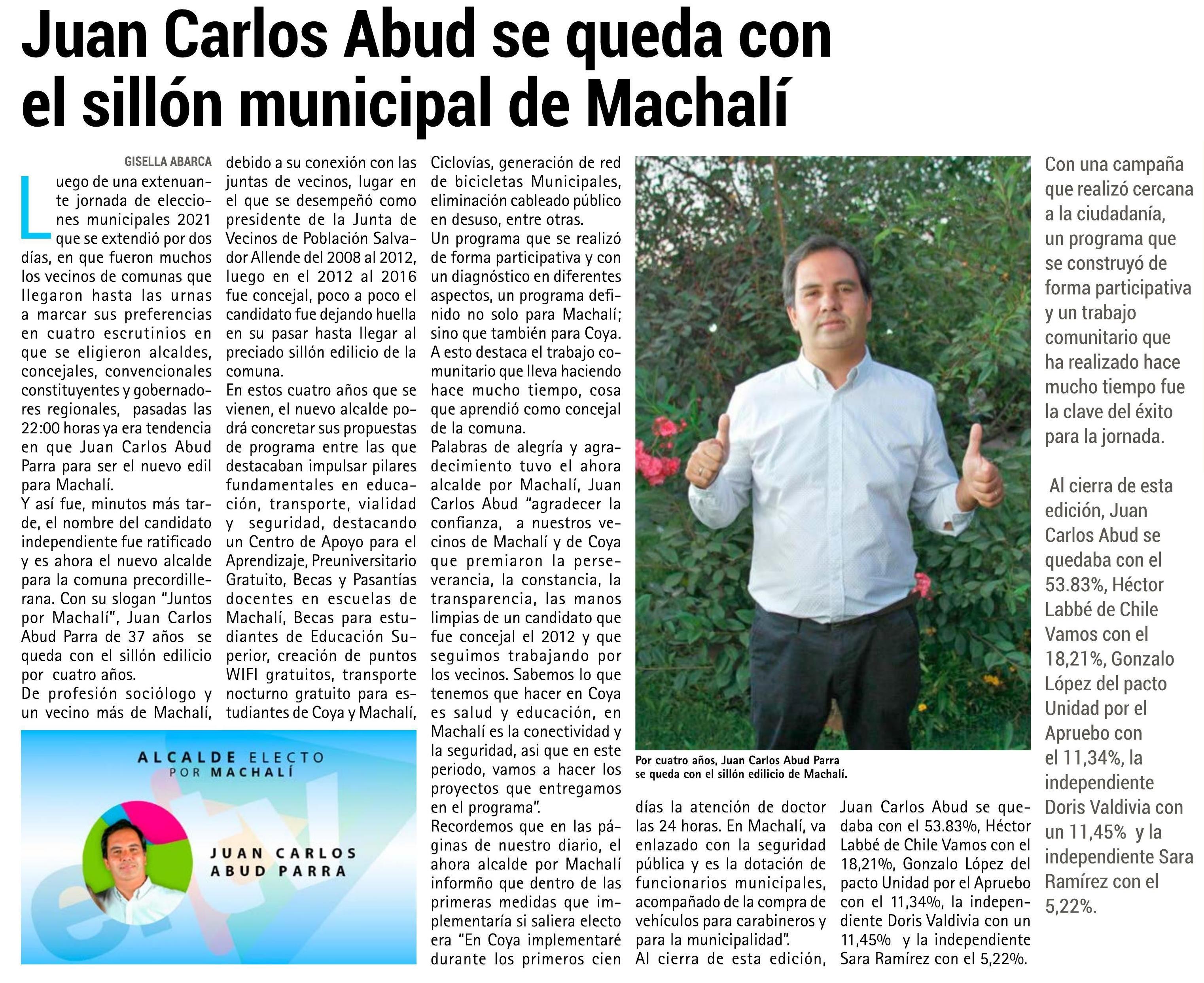 Juan Carlos Abud se queda con el sillón municipal de Machali 17-05-2021 El Rancagüino |