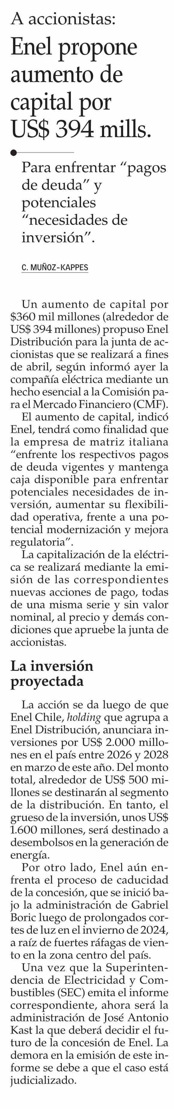 Enel propone aumento de capital por US$ 394 mills. 08-04-2026 El Mercurio |