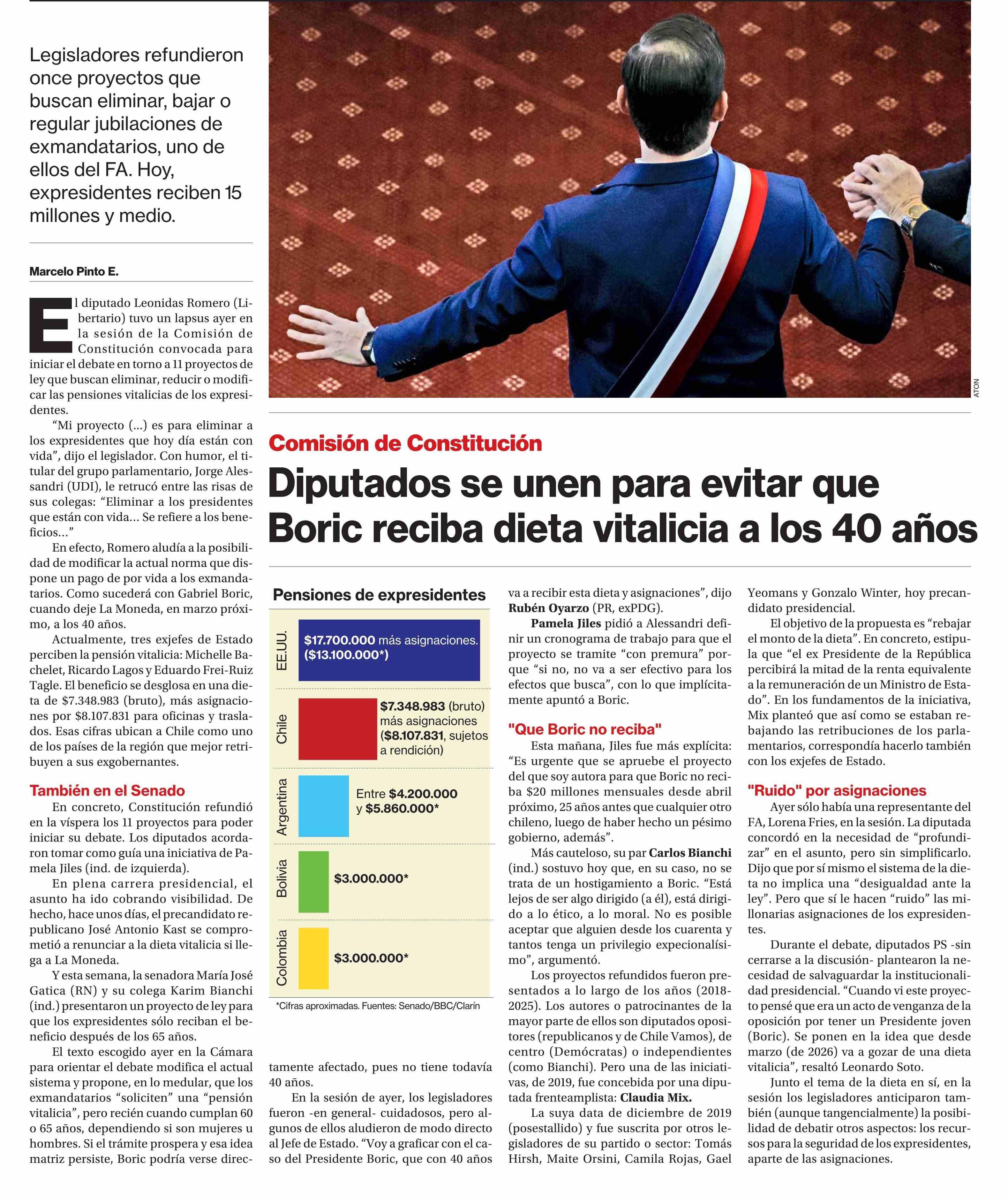 Diputados se unen para evitar que Boric reciba dieta vitalicia a los 40 años 12-06-2025 La Segunda |