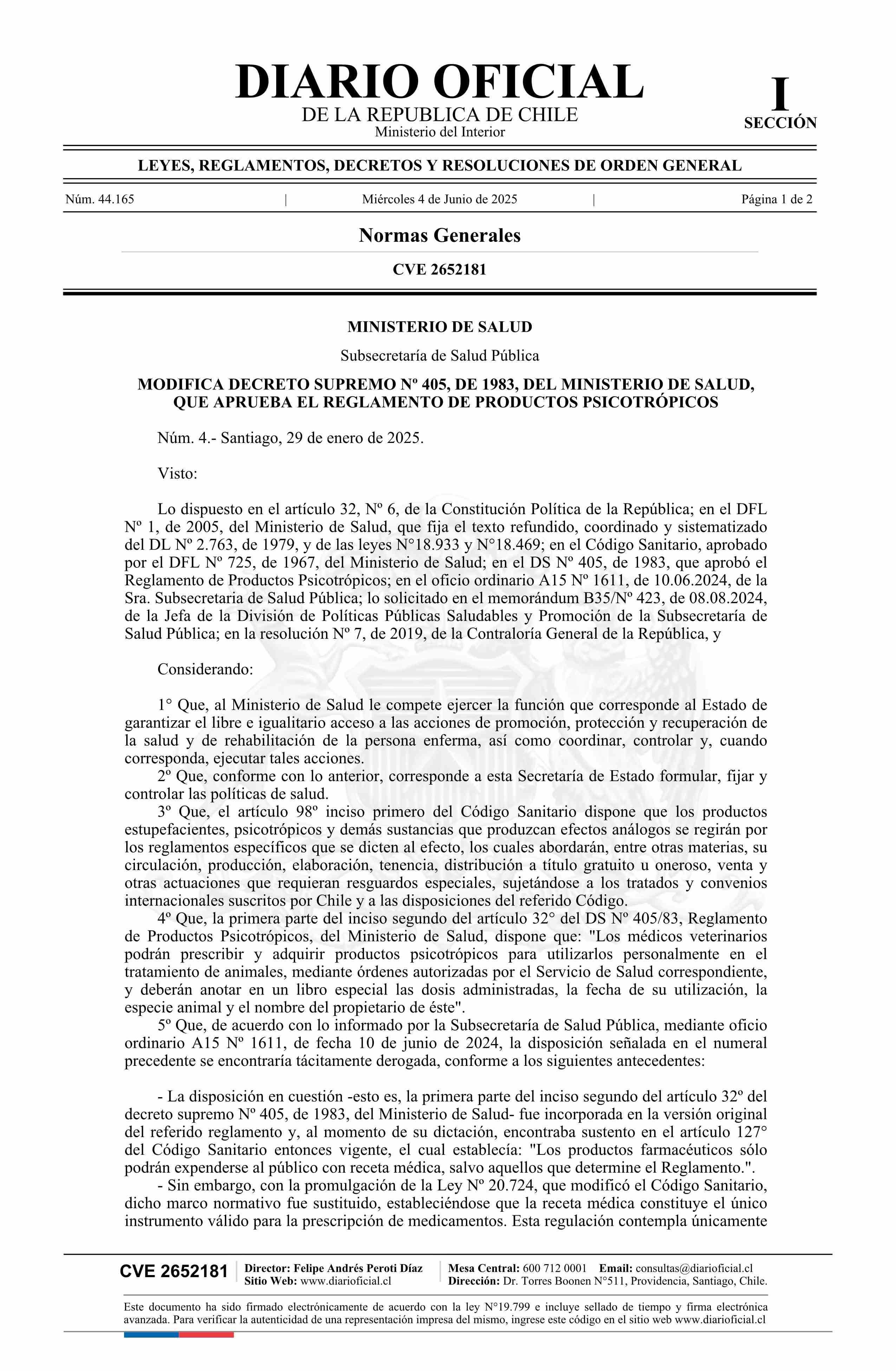 | Título: | Decreto número 4, de 2025.- Modifica decreto Nº 405, de 1983, que aprueba el Reglamento de Productos Psicotrópicos |