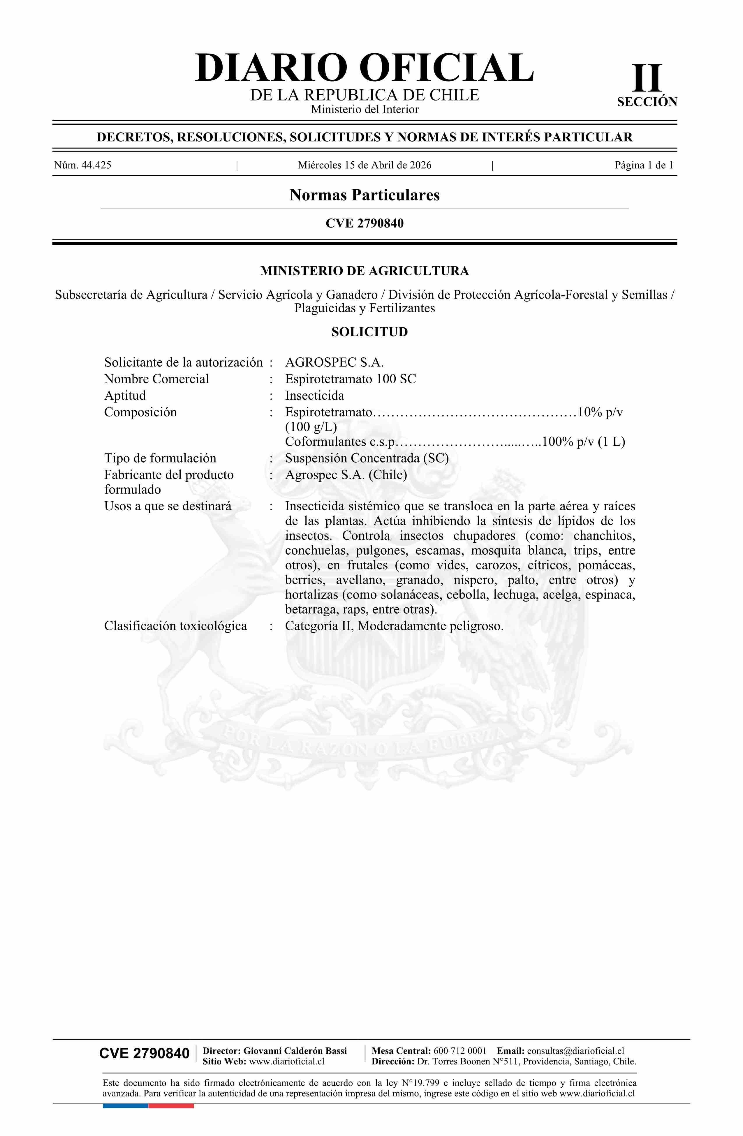 Solicitud Agrospec S.A. 15-04-2026 Diario Oficial Edición Electrónica |