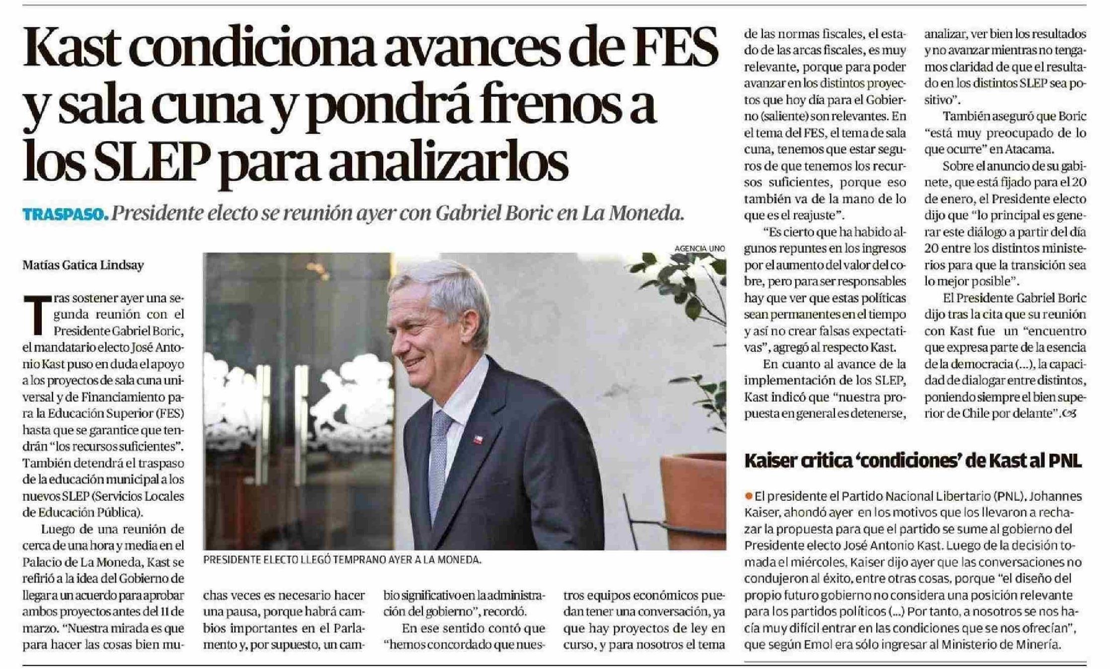 | Título: | Kast condiciona avances de FES y sala cuna y pondrá frenos a los SLEP para analizarlos |