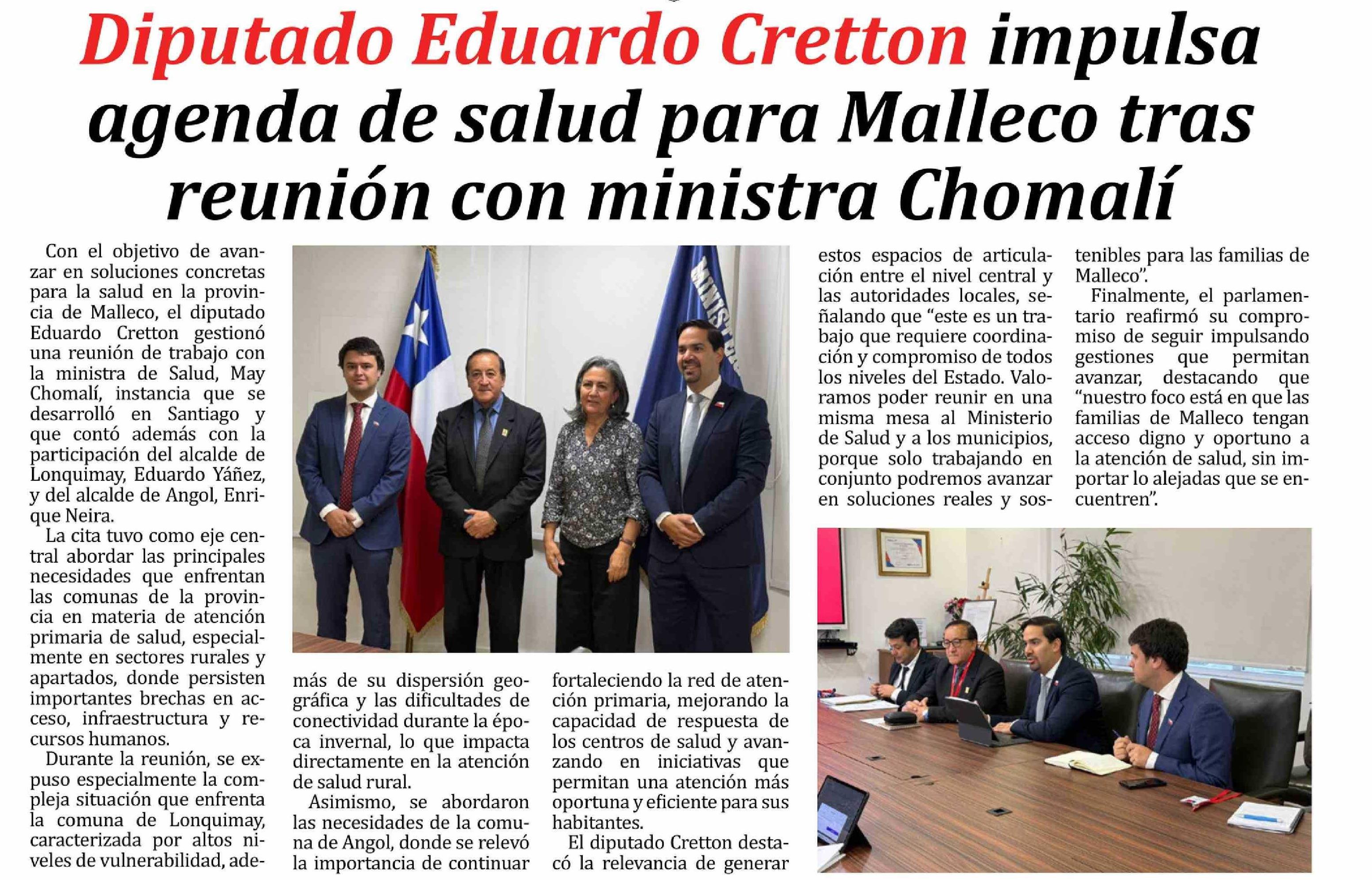 | Título: | Diputado Eduardo Cretton impulsa agenda de salud para Malleco tras reunión con ministra Chomalí |