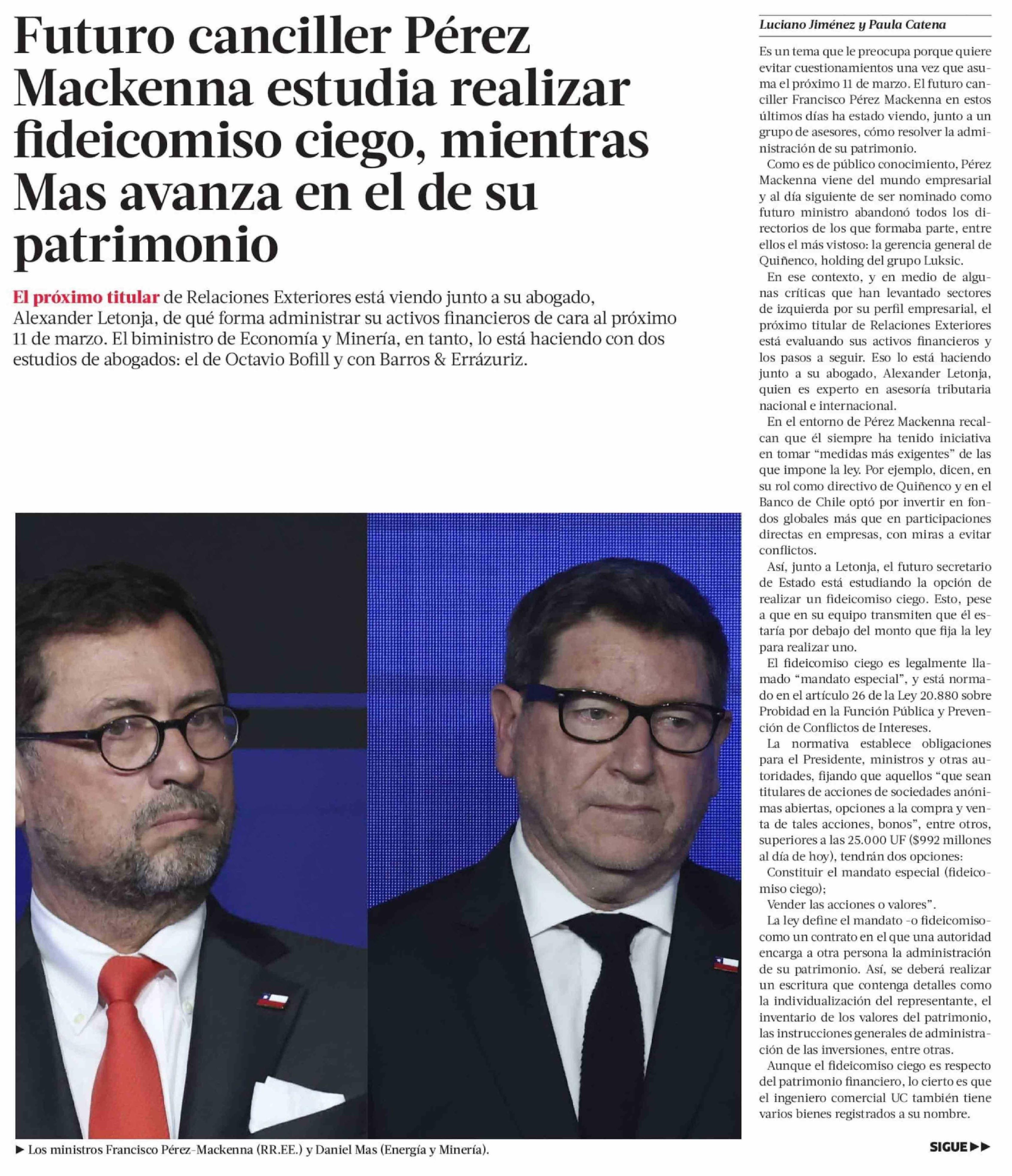 | Título: | Futuro canciller Pérez Mackenna estudia realizar fideicomiso ciego, mientras Mas avanza en el de su patrimonio |