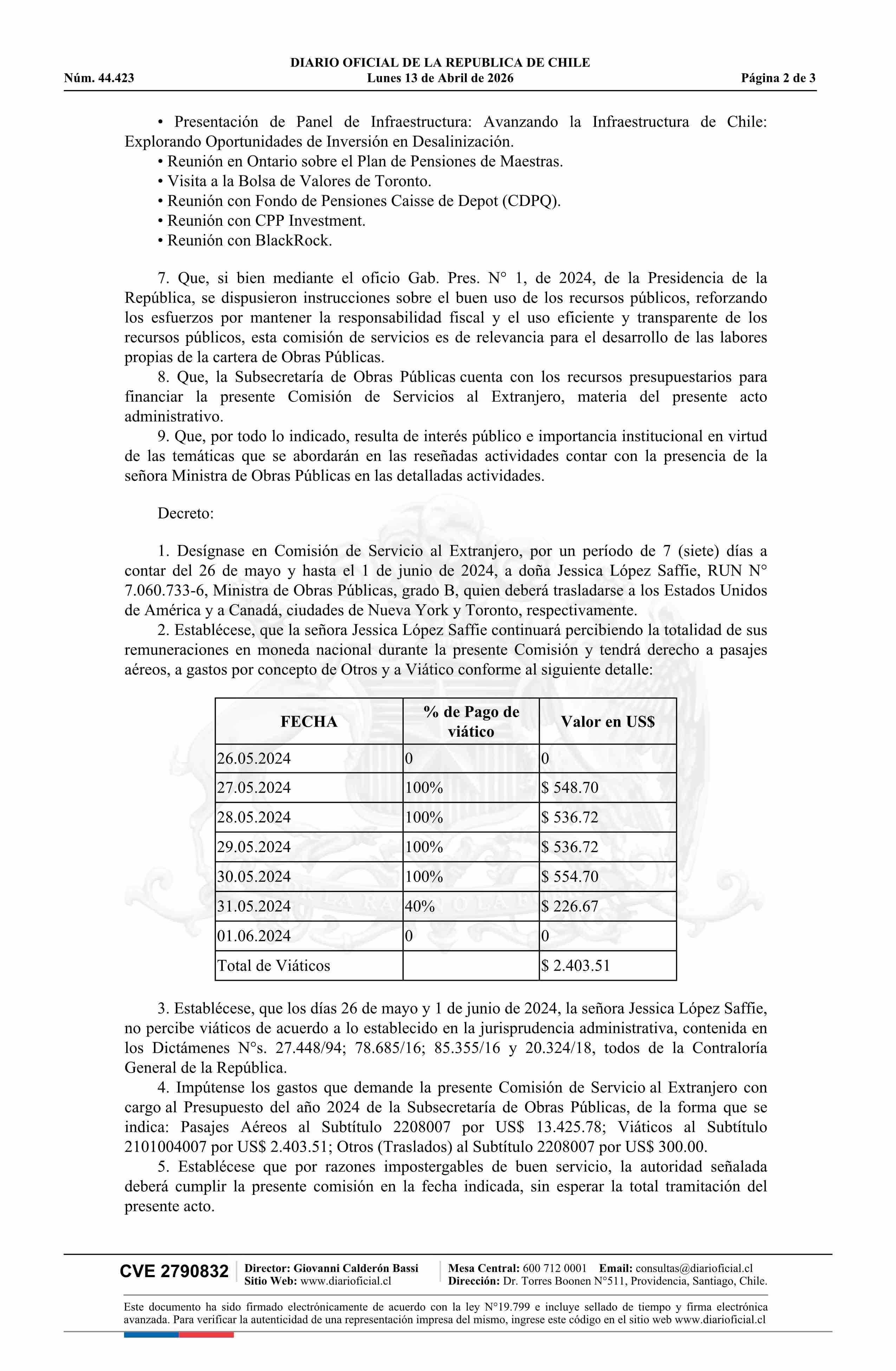 Decreto número 50, de 2024.- Designa en comisión de servicio al extranjero a doña Jessica López Saffie, Ministra de Obras Públicas, a Canadá y Estados Unidos de América 13-04-2026 Diario Oficial Edición Electrónica |