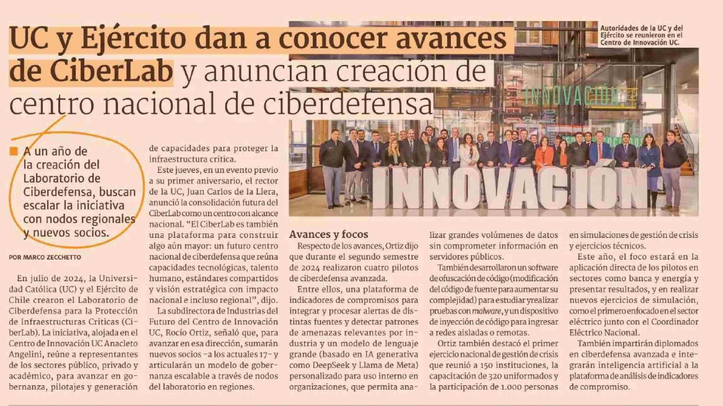 UC y Ejército dan a conocer avances de CiberLab y anuncian creación de PP centro nacional de ciberdefensa 26-05-2025 Diario Financiero |