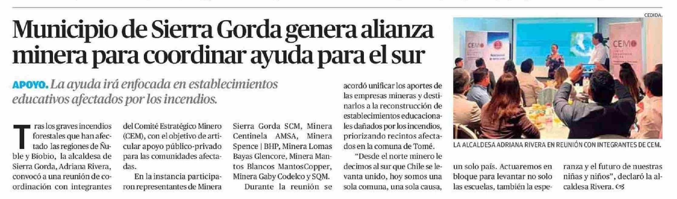 Municipio de Sierra Gorda genera alianza minera para coordinar ayuda para el sur 23-01-2026 El Mercurio de Calama |