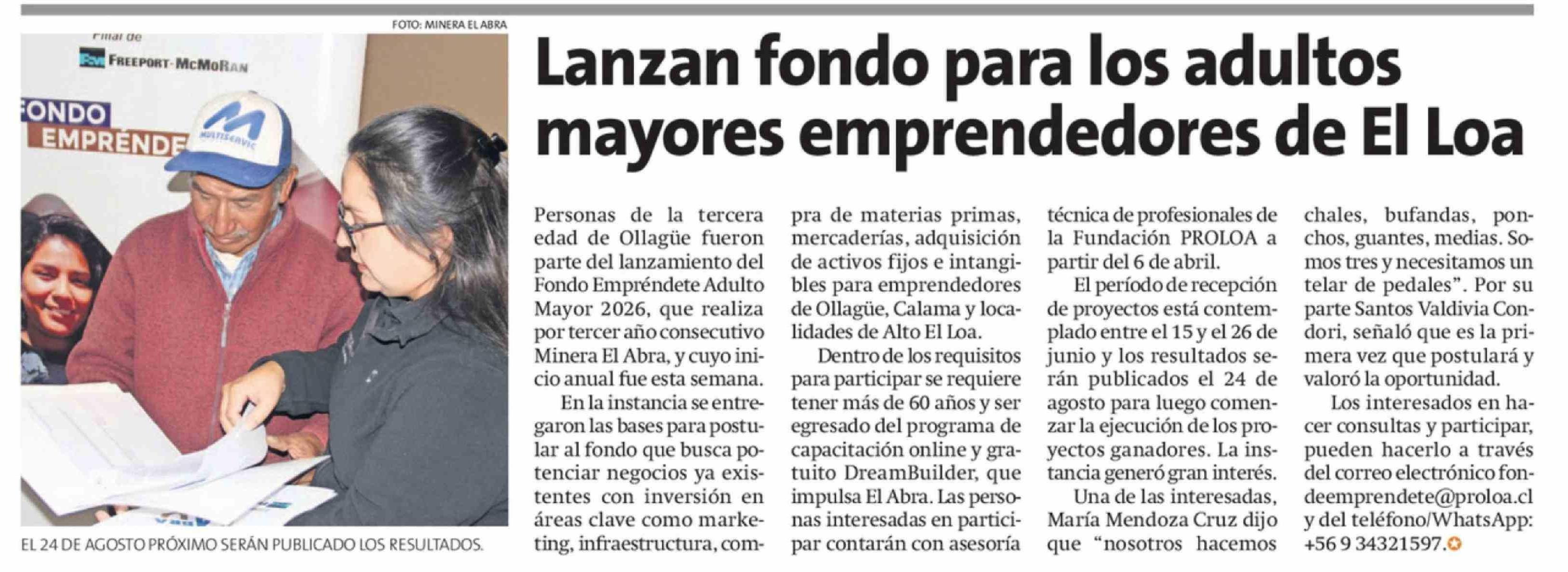 Lanzan fondo para los adultos mayores emprendedores de El Loa 08-04-2026 La Estrella de Antofagasta |