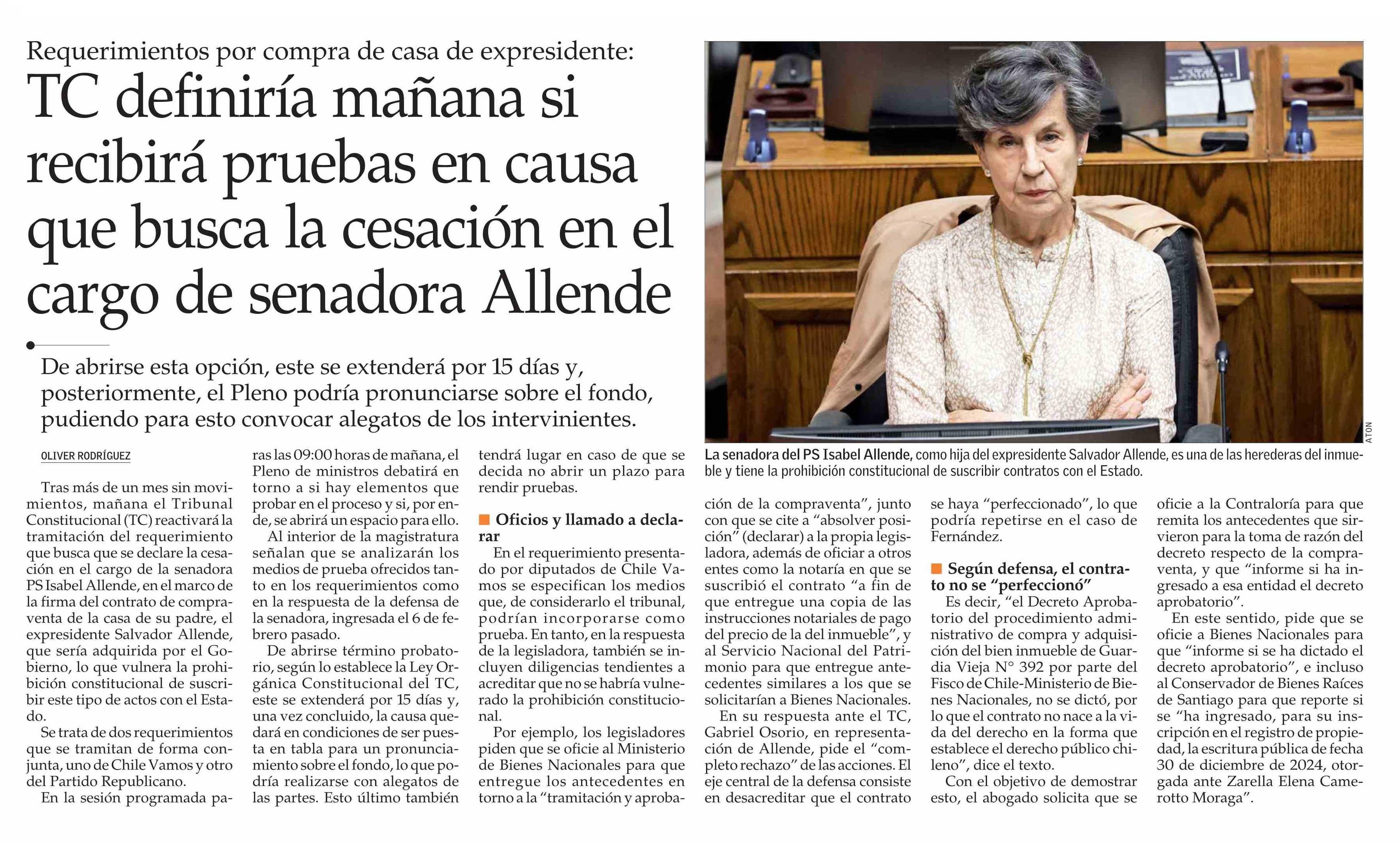 TC definiría mañana si recibirá pruebas en causa que busca la cesación en el cargo de senadora Allende 18-03-2025 El Mercurio |