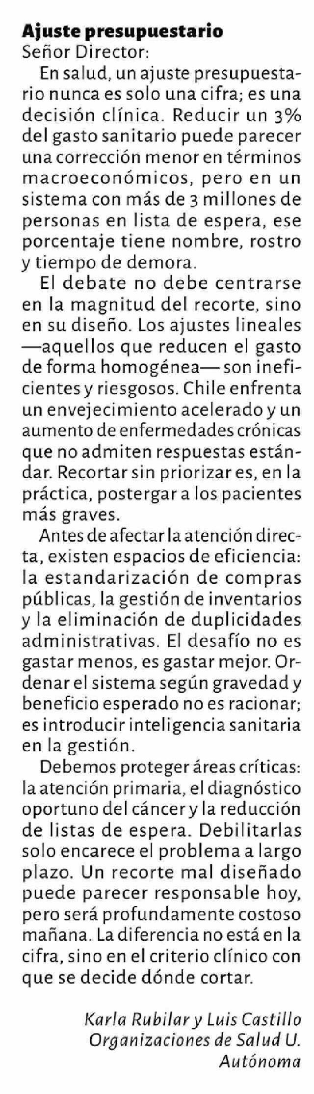 | Título: | Cartas: Ajuste presupuestario Señor Director: En salud, un ajuste presupuestario nunca es solo una cifra; es una decisión clínica. Reducir un 3% del gasto sanitario puede parecer una corrección menor en términos macroeconómicos, pero en un sistema con más de 3 millones de personas en lista de espera |