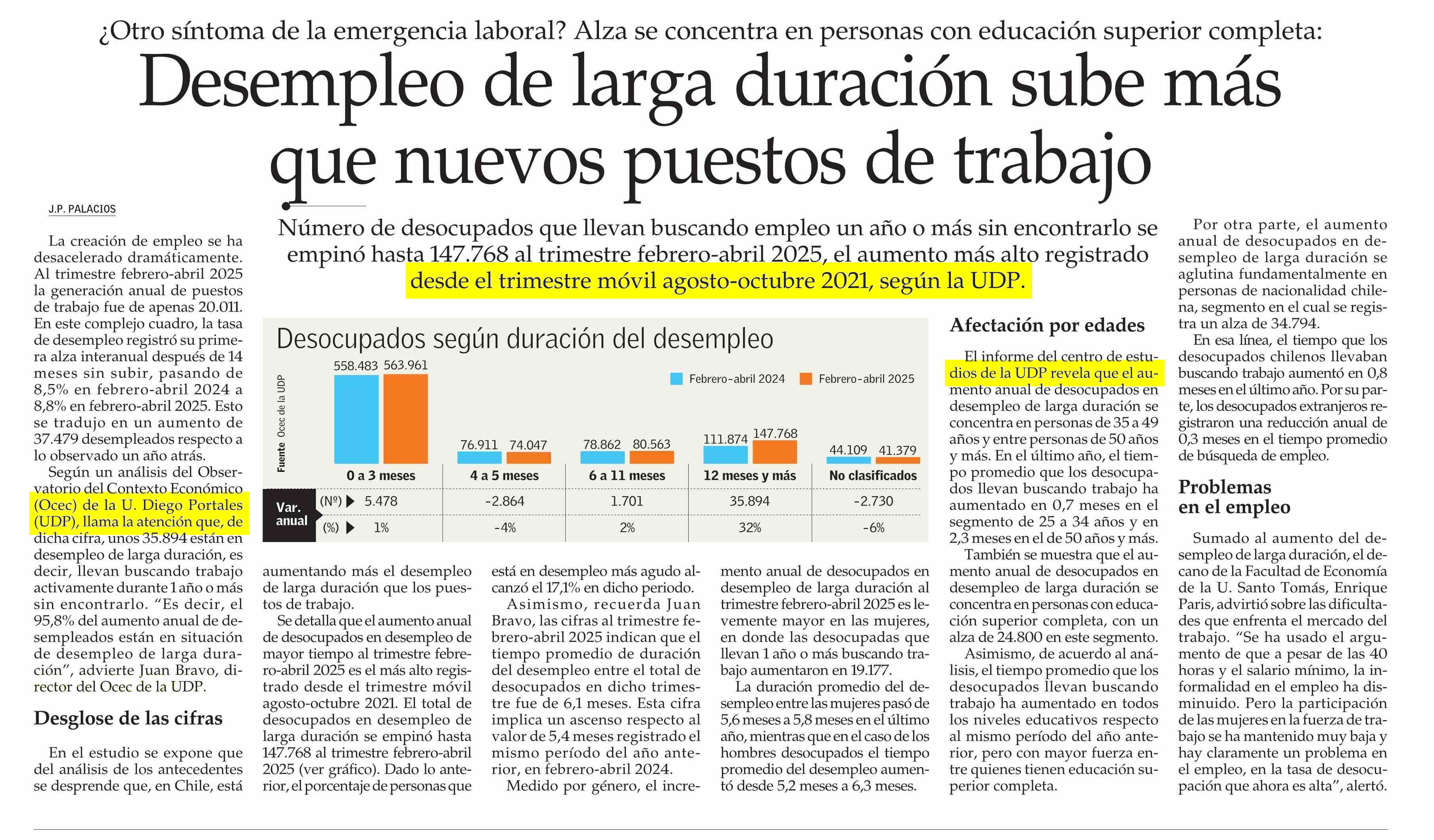 Desempleo de larga duración sube más que nuevos puestos de trabajo 09-06-2025 El Mercurio |