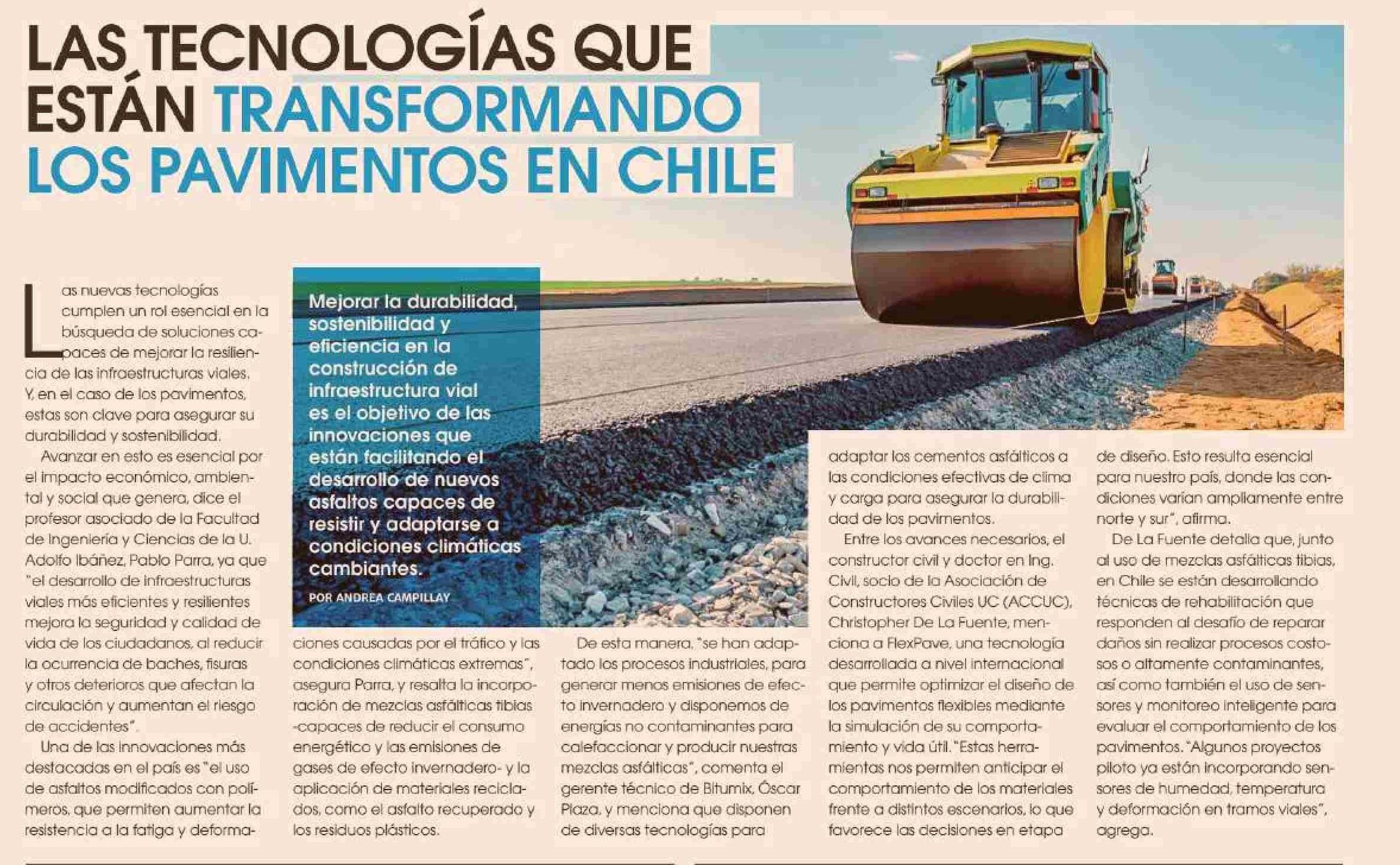 LAS TECNOLOGÍAS QUE ESTÁN TRANSFORMANDO LOS PAVIMENTOS EN CHILE 27-03-2025 Diario Financiero |