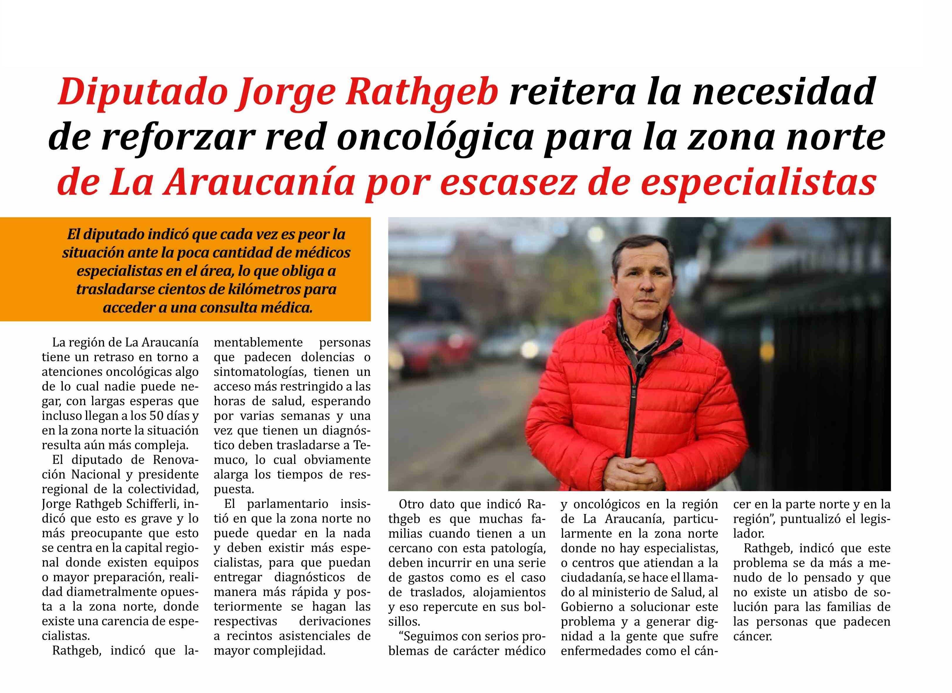 | Título: | Diputado Jorge Rathgeb reitera la necesidad de reforzar red oncológica para la zona norte de La Araucanía por escasez de especialistas |