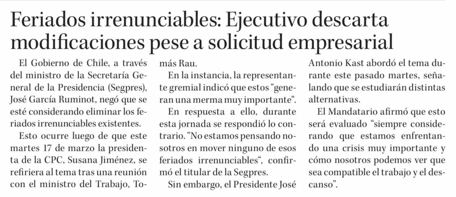 Título: Feriados irrenunciables: Ejecutivo descarta modificaciones pese a solicitud empresarial