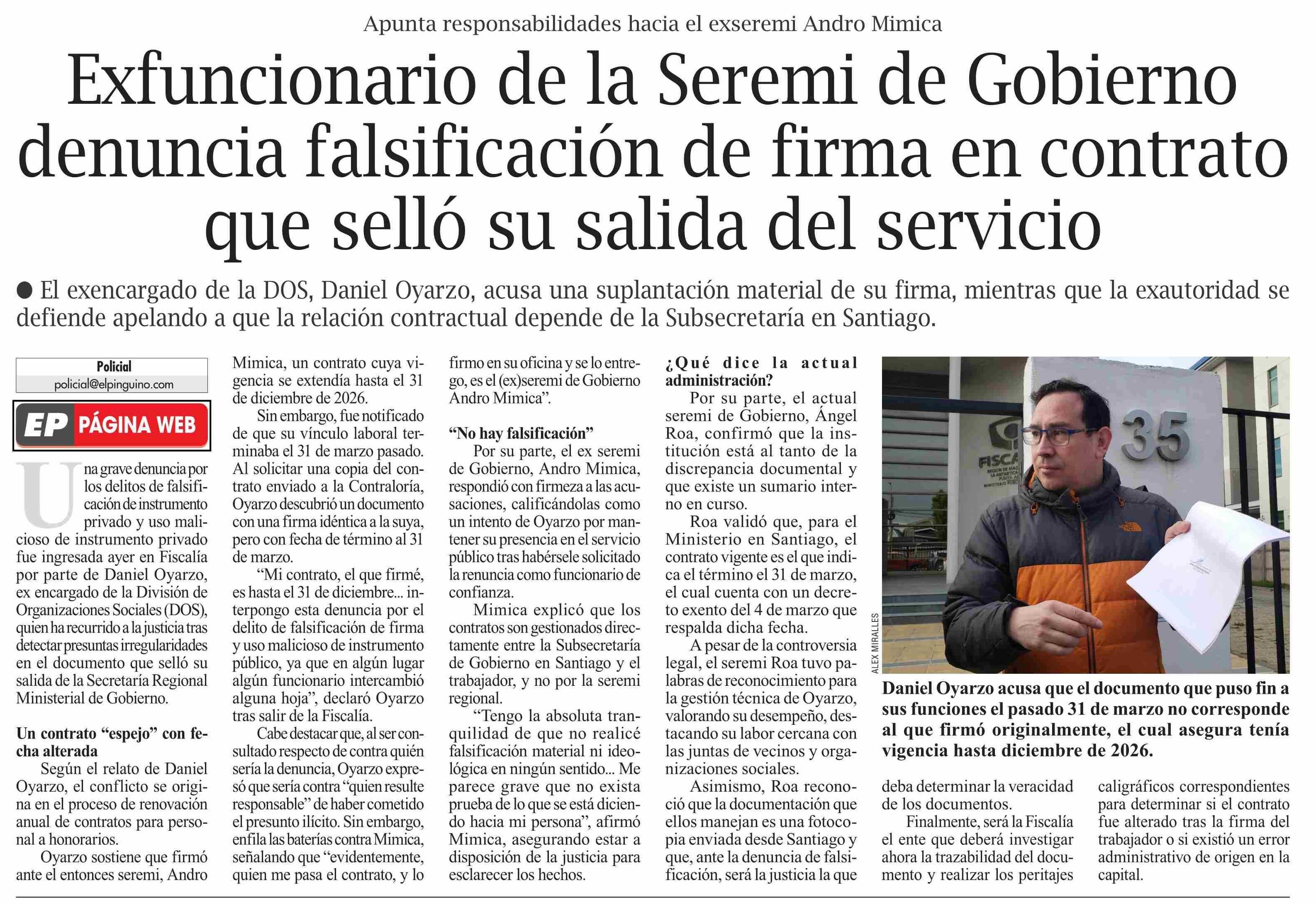 Exfuncionario de la Seremi de Gobierno denuncia falsificación de firma en contrato que selló su salida del servicio 08-04-2026 El Pingüino |