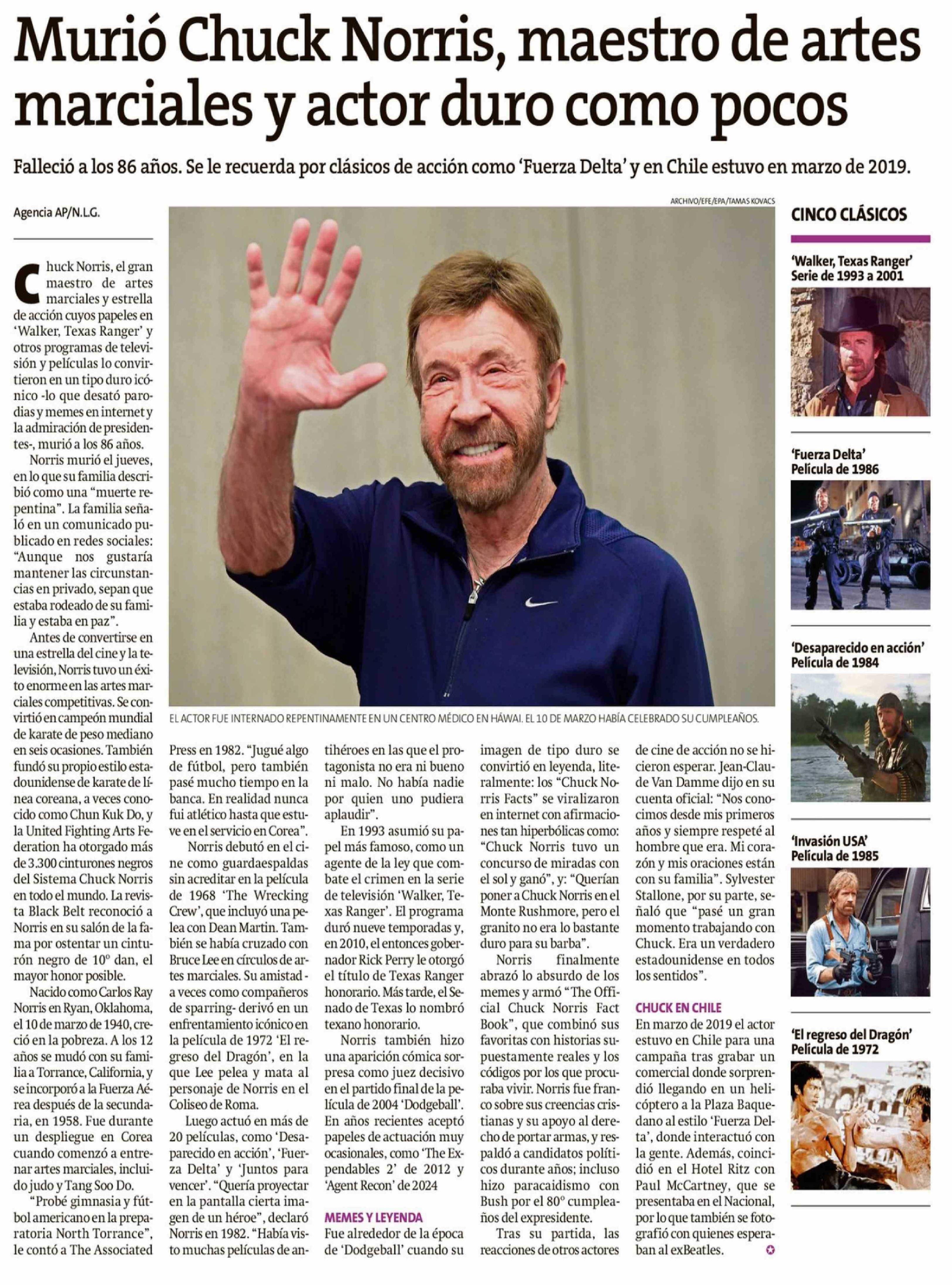 | Título: | Murió Chuck Norris, maestro de artes marciales y actor duro como pocos |