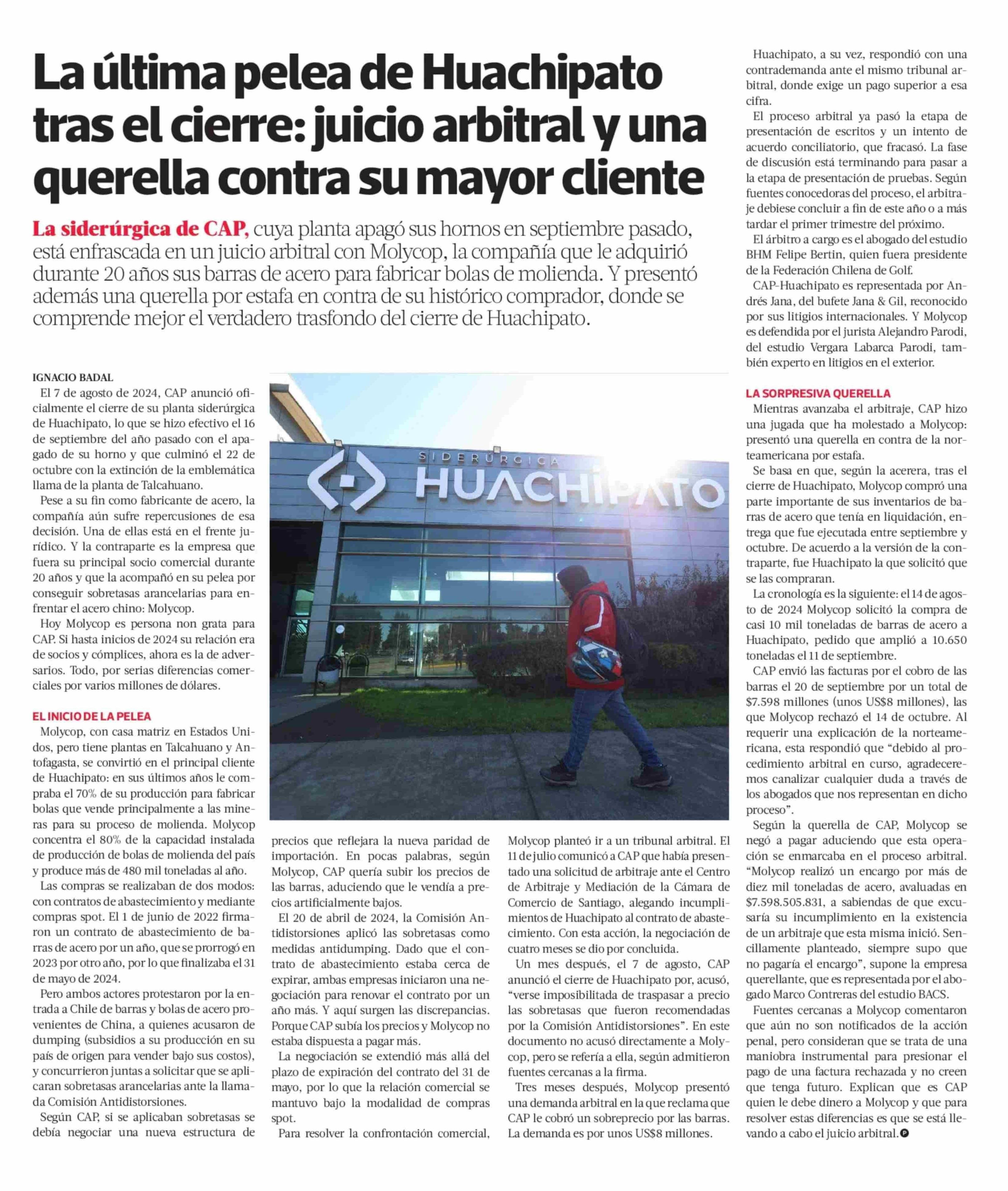 La última pelea de Huachipato tras el cierre: juicio arbitral y una querella contra su mayor cliente 16-06-2025 La Tercera |