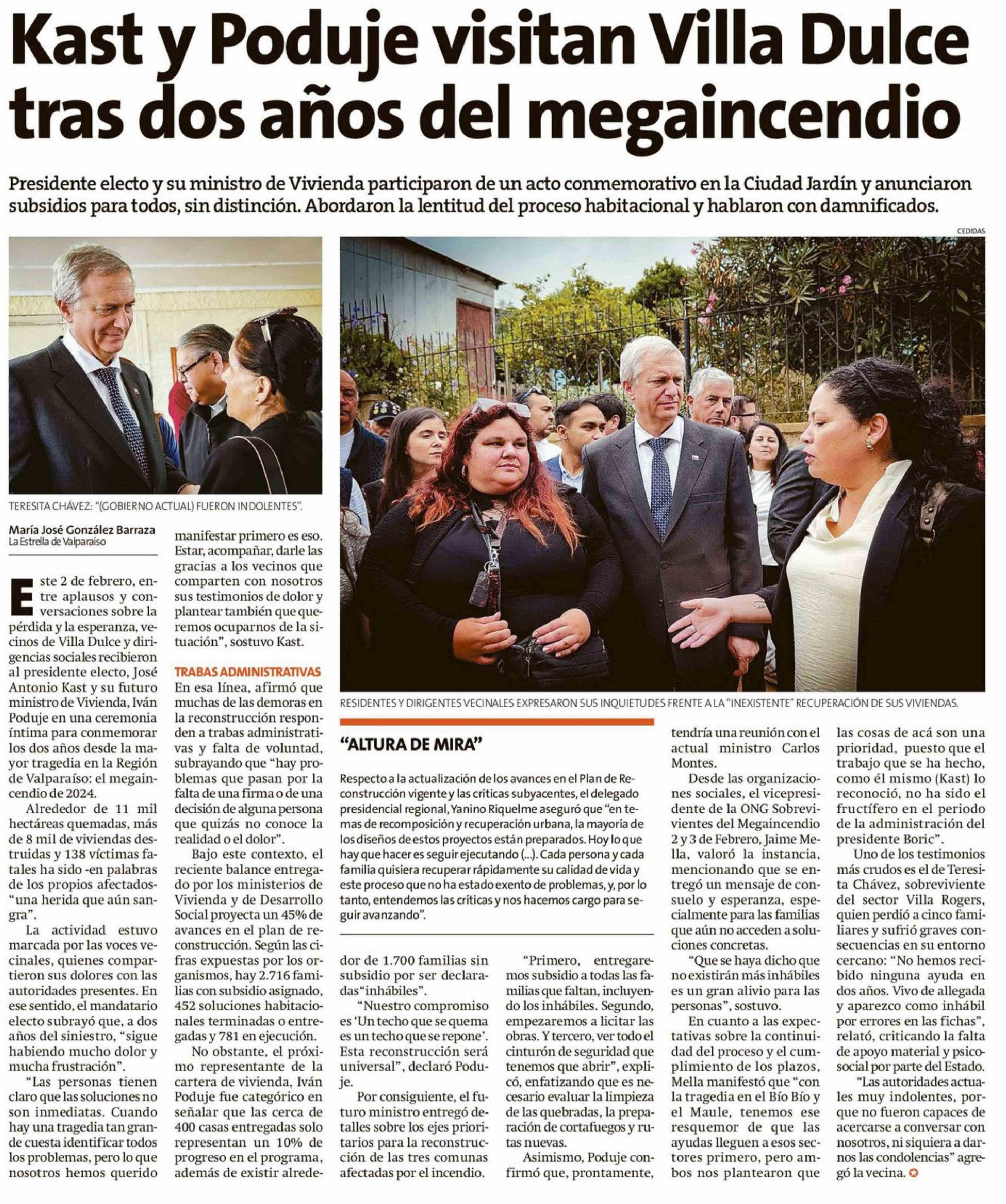 Kast y Poduje visitan Villa Dulce tras dos años del megaincendio 03-02-2026 La Estrella de Valparaíso |