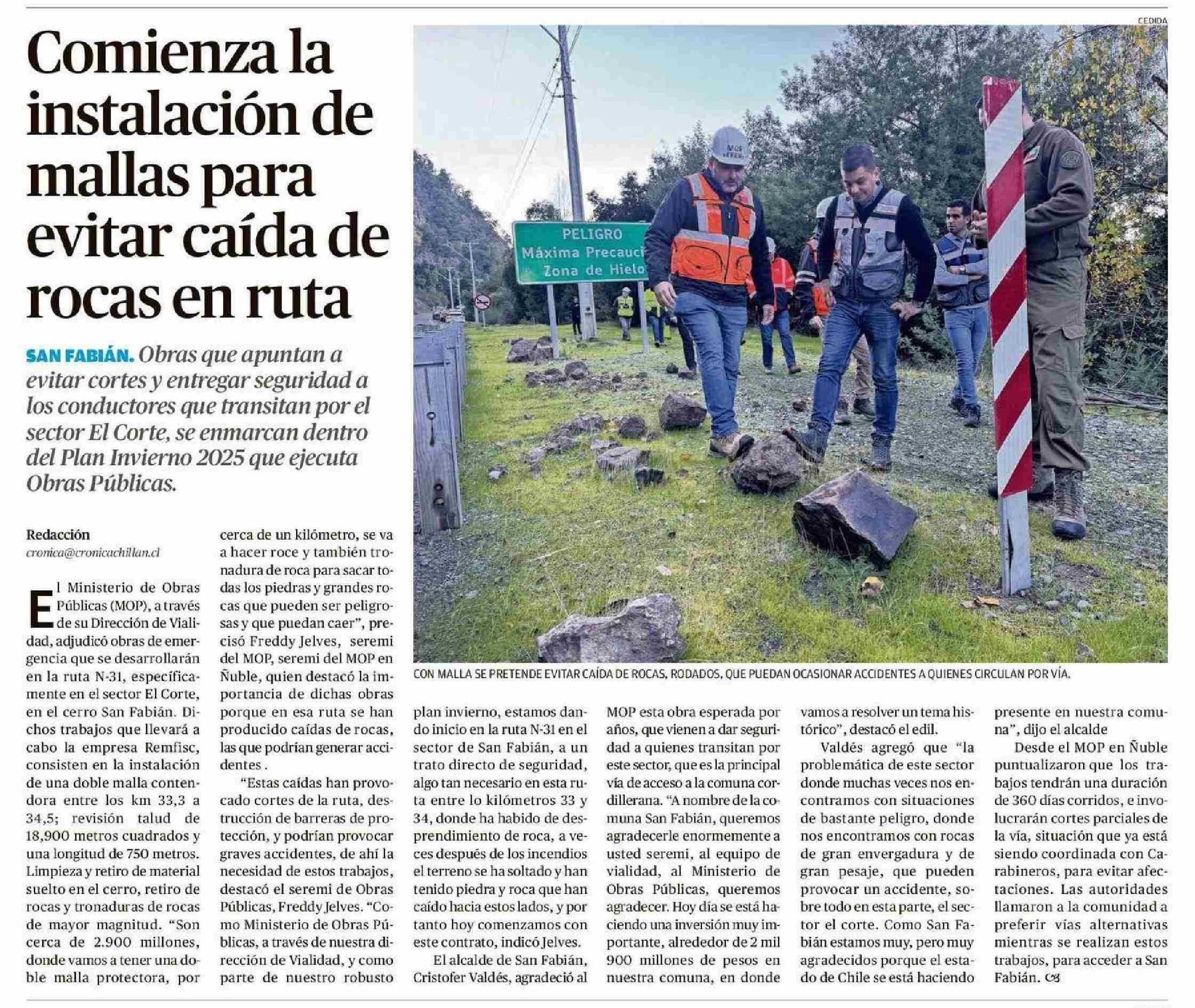 Comienza la instalación de mallas para evitar caída de rocas en ruta 10-06-2025 Crónica de Chillán |
