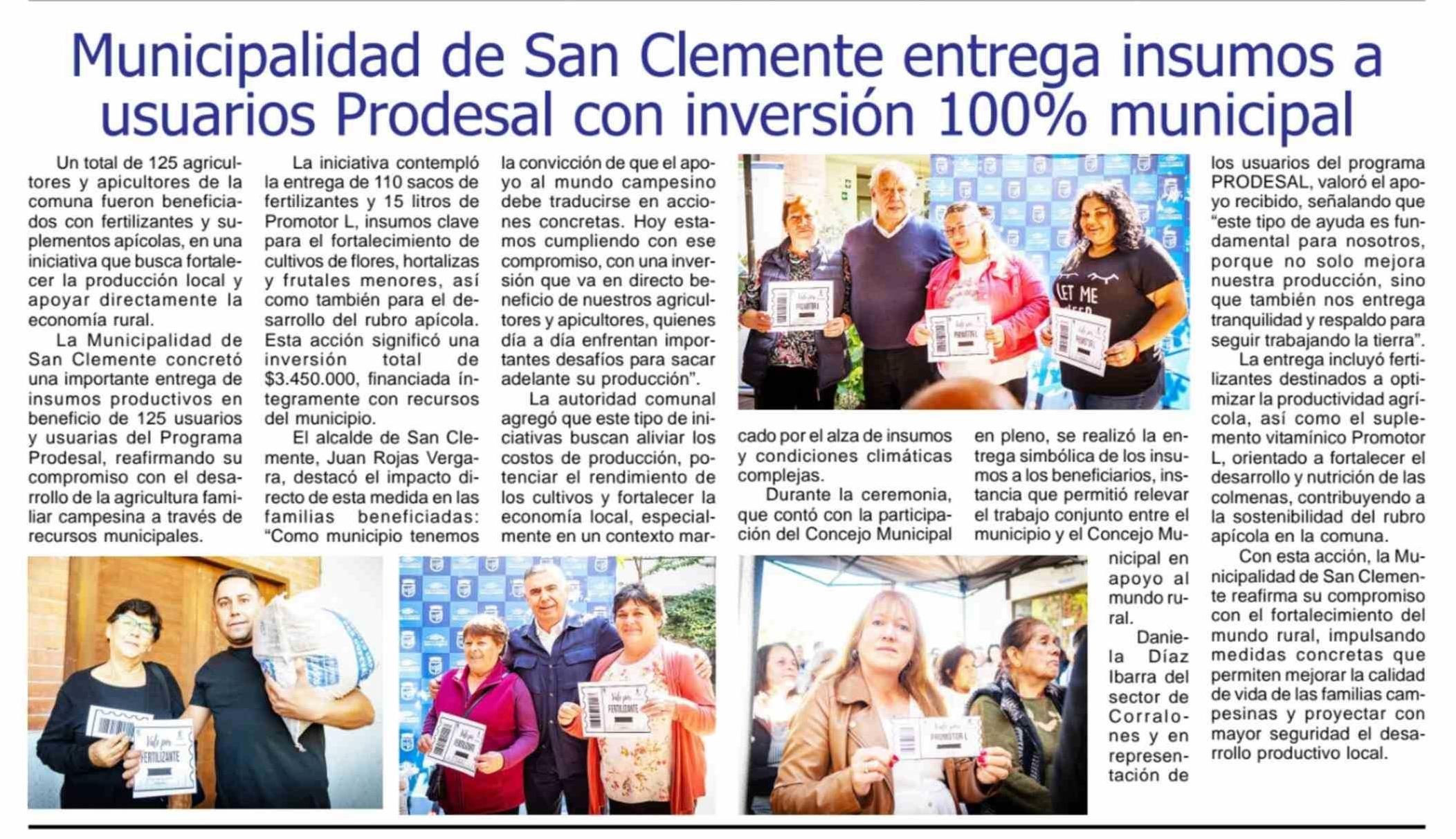 Municipalidad de San Clemente entrega insumos a usuarios Prodesal con inversión 100% municipal 01-04-2026 Maule Hoy |