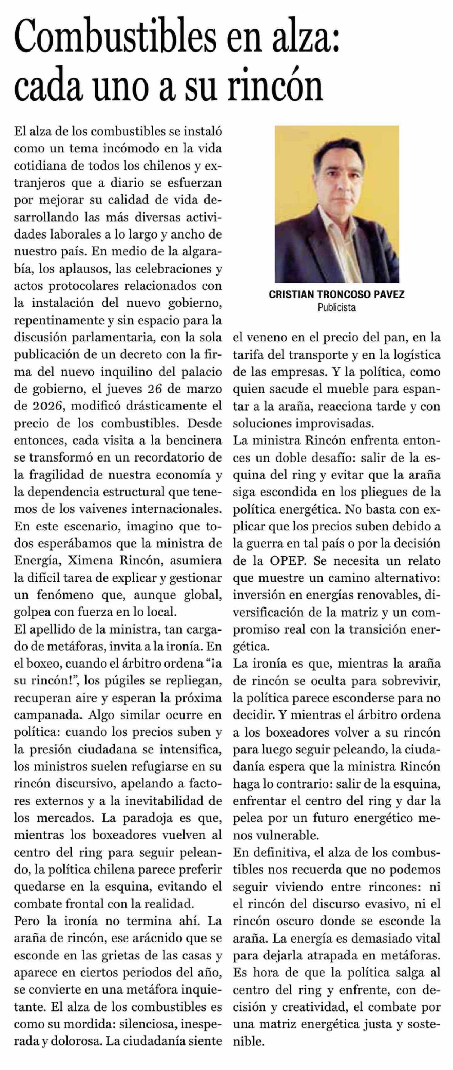Columnas de Opinión: Combustibles en alza: cada uno a su rincón 03-04-2026 La Prensa de Curicó |