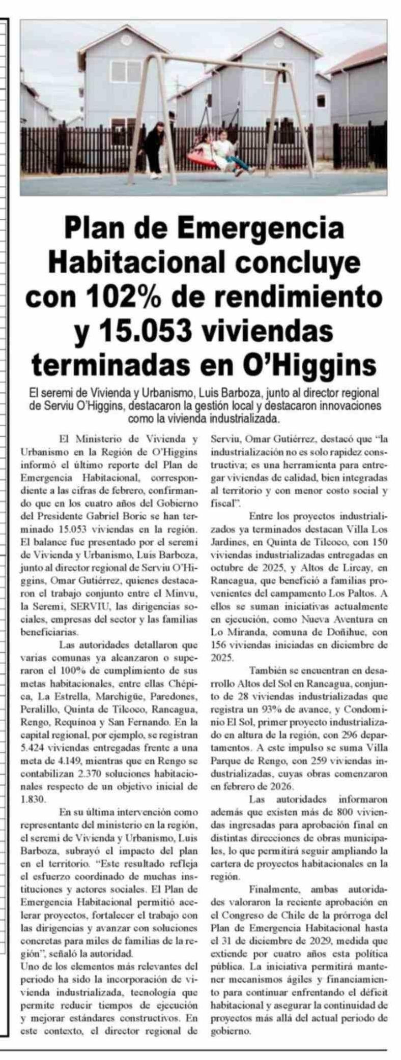 Título: Plan de Emergencia Habitacional concluye con 102% de rendimiento y 15.053 viviendas terminadas en O'Higgins