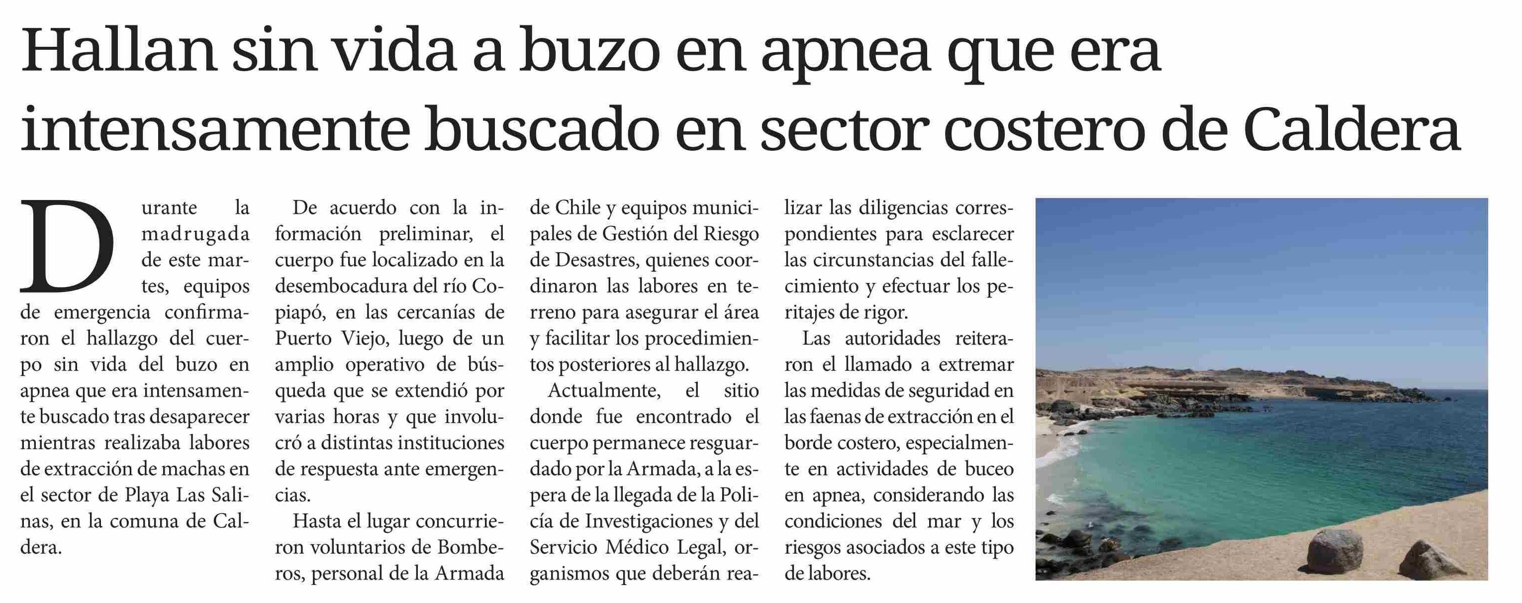 | Título: | Hallan sin vida a buzo en apnea que era intensamente buscado en sector costero de Caldera |