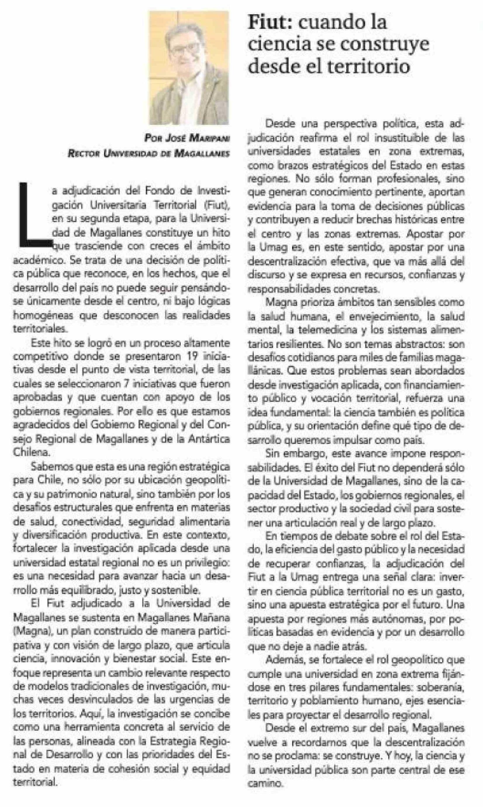 Columnas de Opinión: Fiut: cuando la ciencia se construye desde el territorio 17-01-2026 La Prensa Austral |