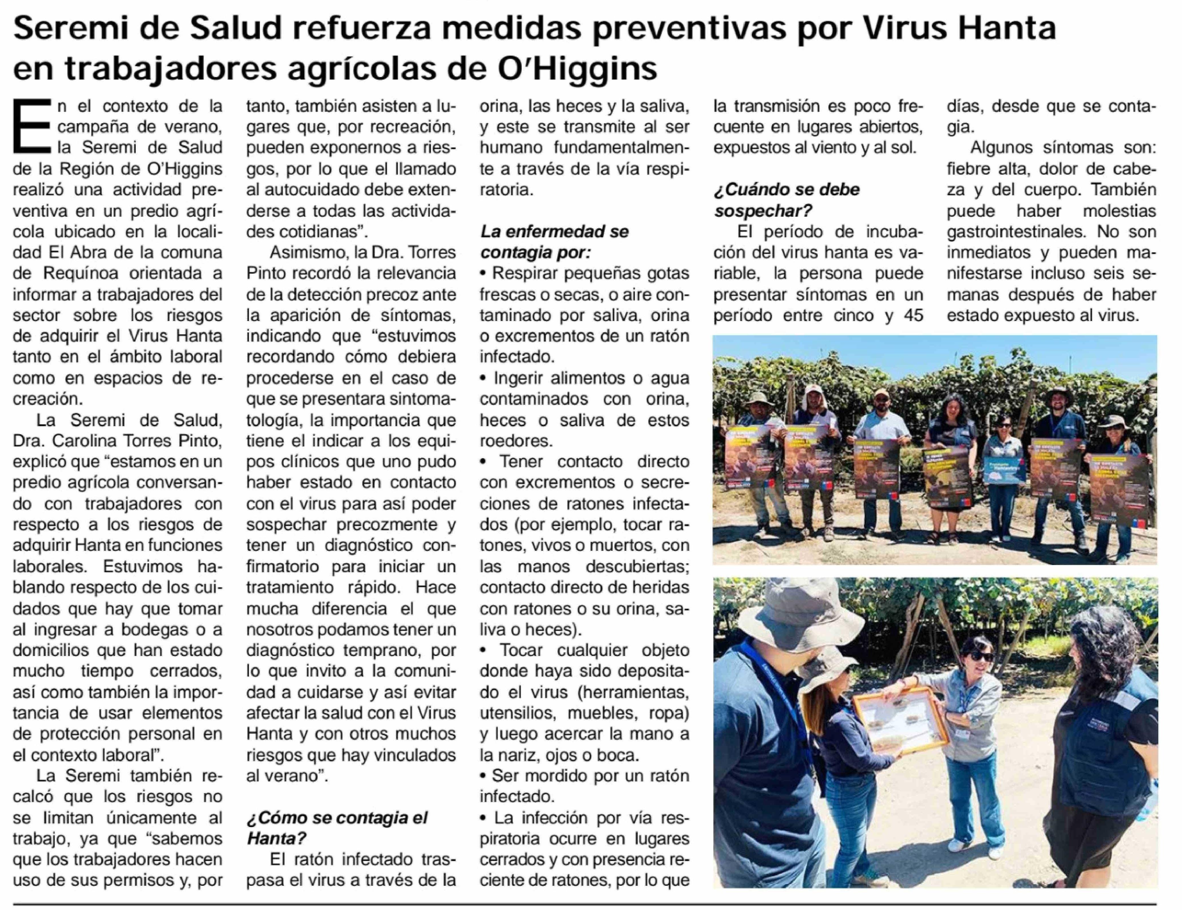 Seremi de Salud refuerza medidas preventivas por Virus Hanta en trabajadores agrícolas de O'Higgins 31-01-2026 Diario El Cóndor |