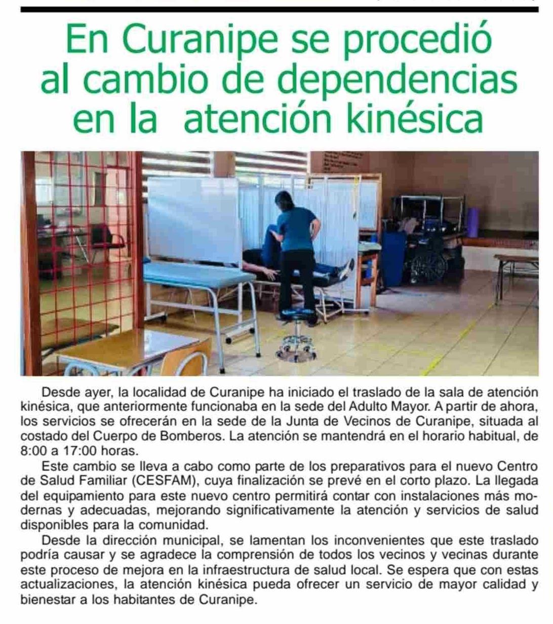 | Título: | En Curanipe se procedió al cambio de dependencias en la atención kinésica |