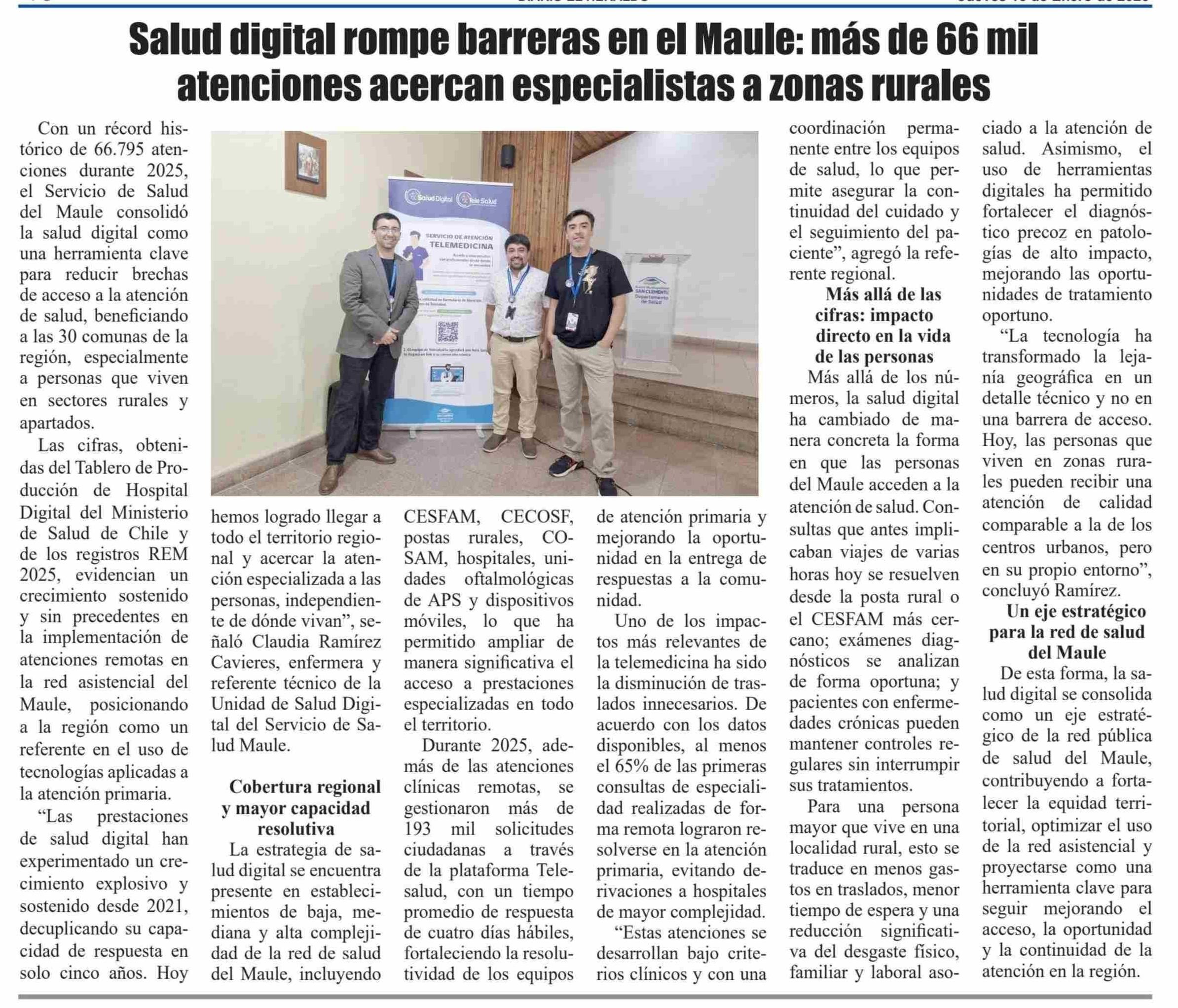 | Título: | Salud digital rompe barreras en el Maule: más de 66 mil atenciones acercan especialistas a zonas rurales |
